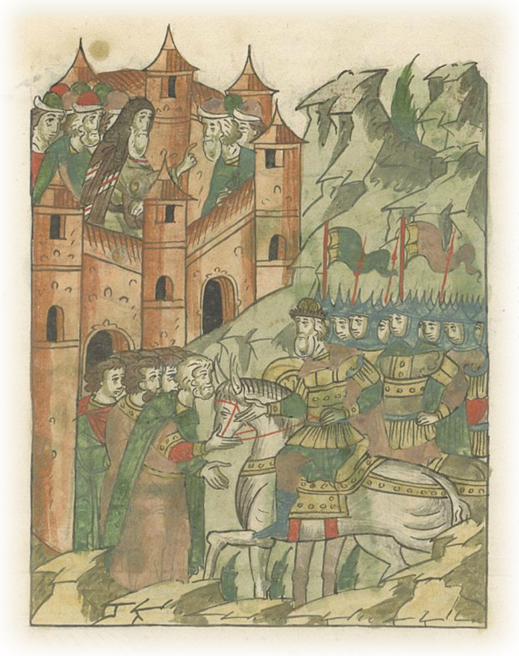 И владыка Смоленский Варсонофий, князья и бояре смоленские, и мещане, и все горожане вышли из города бить челом, чтобы великий государь свою отчину и дедину пожаловал, опалу свою и гнев отложил, повелел бы предстать пред свои очи и служить себе повелел.