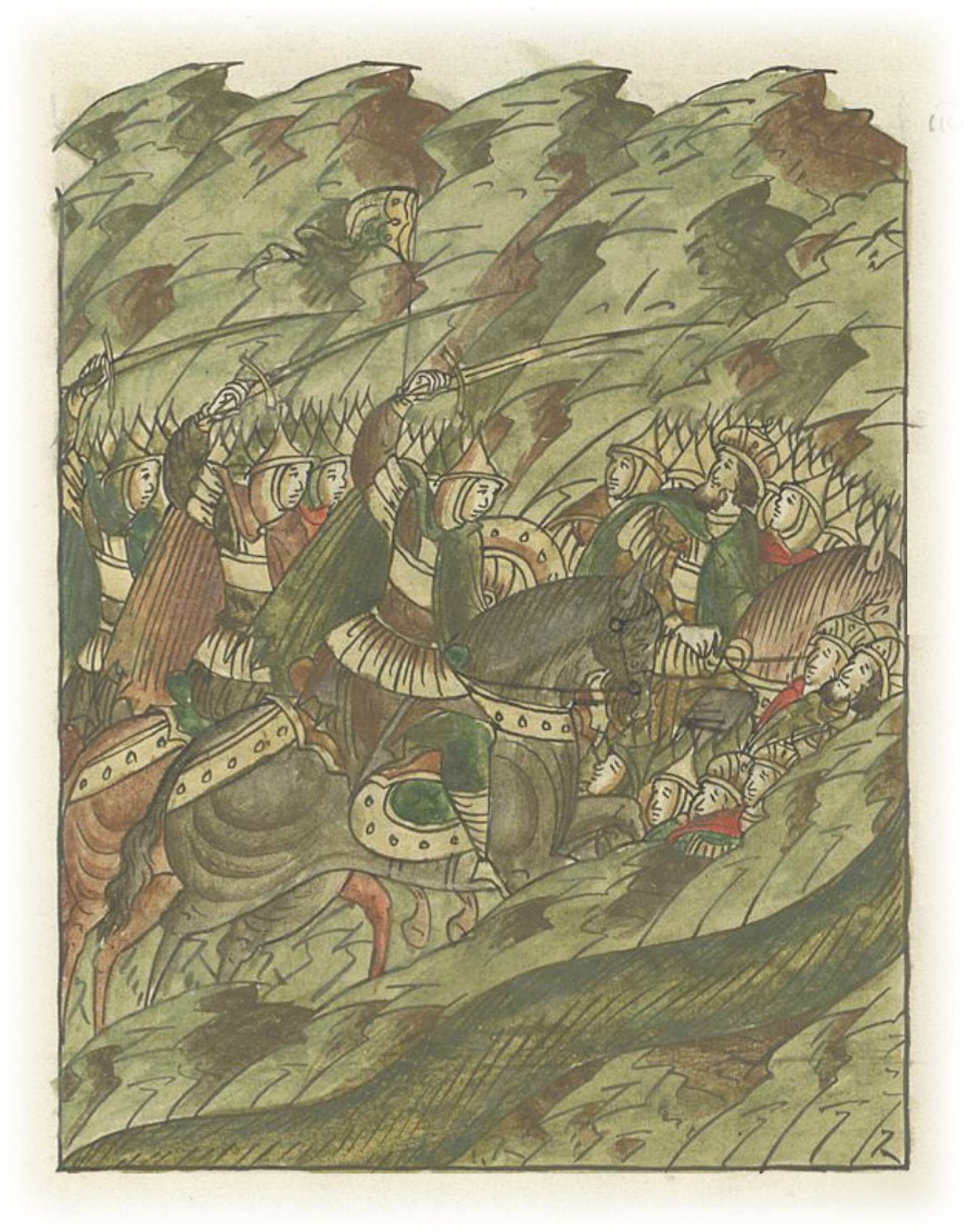А иных князей избили, гоня до Днепра: шестерых князей - князя Каневского Святослава, князя Изяслава Ингваревича, князя Шумского Святослава, князя Черниговского Мстислава с сыном, князя Неверского Юрия, тысяцких, и воевод, и бояр множество; а воинских людей столько было убито, что едва лишь десятый из них смог убежать.