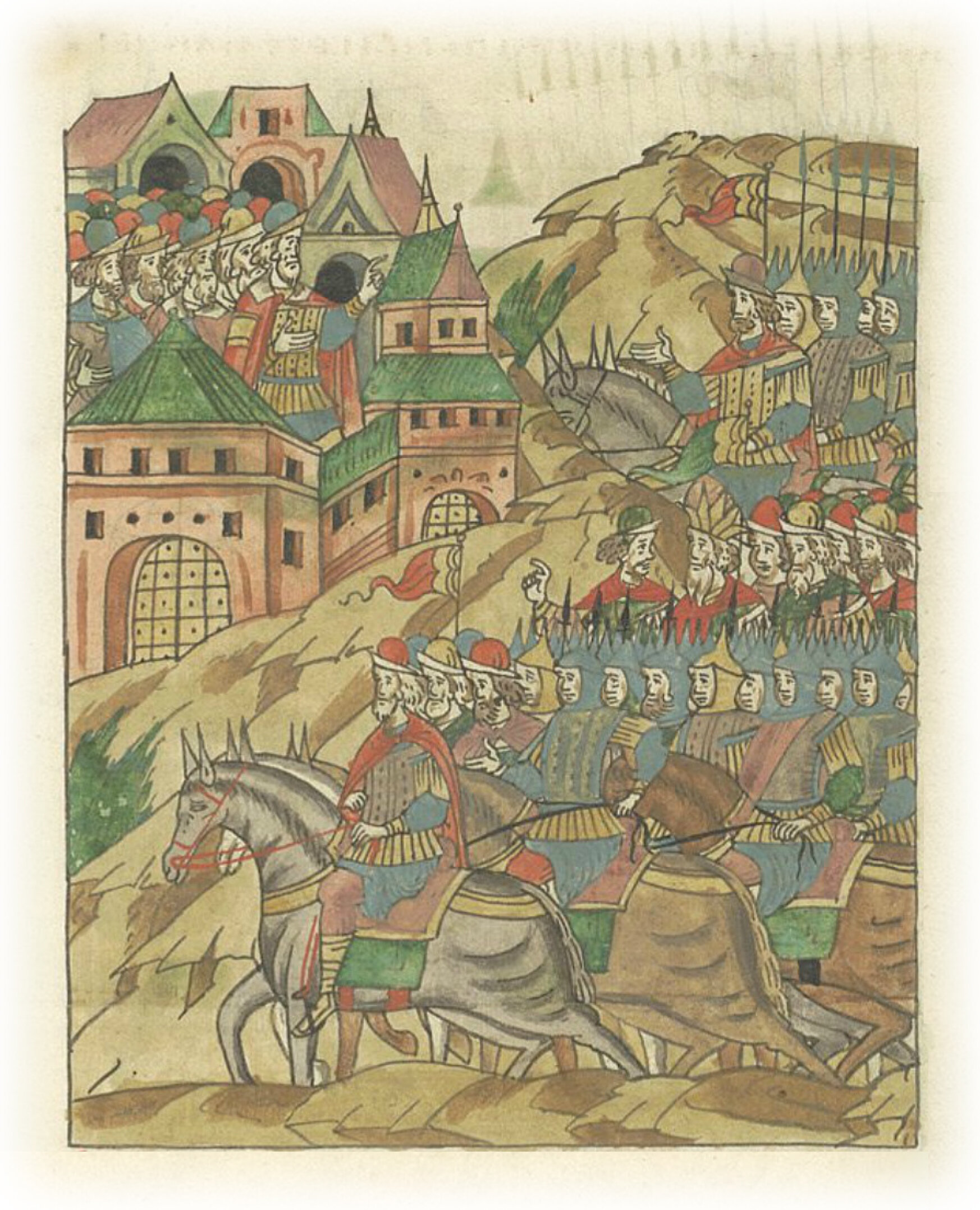 И потом небольшим отрядом приехали к городу и спросили о великом князе, говоря так: «Есть ли князь Дмитрий в городе?» Они же отвечали им с городских стен, говоря: «Нет его в городе».