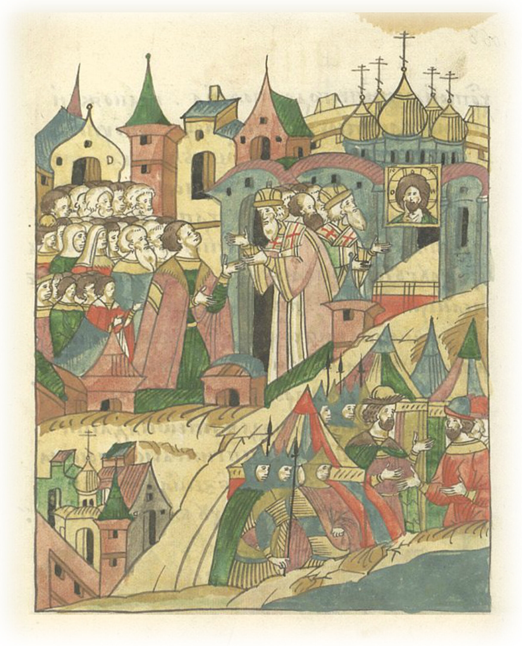 Об усердном молении митрополита Киприана. В Москве же оставил князя Владимира Андреевича, внука Ивана Даниловича Калиты. Преосвященный митрополит Киприан тогда украшал престол Русской митрополии и трудился прилежно повседневно и ежечасно, не отступая от церкви, постоянно вознося слезные молитвы и принося бескровные жертвы Богу за благочестивого великого князя и за христианское воинство, и за всех христиан. Также и всему причту церковному вместе с князем, боярами и всеми вельможами, и всем чиновникам, и всему народу мужского и женского пола повелел всем поститься и читать молитвы, (забыть о) вражде друг к другу, вспомнить о братолюбии нелицемерном и всем единомысленно, с печалью в сердцах, и смиренными помыслами, и чистой совестью просить у Бога избавления от наступающей беды и ждать спасения, помня о Ниневийском покаянии израильских царей Иезекия и Манасия. И все выслушали благое его поучение