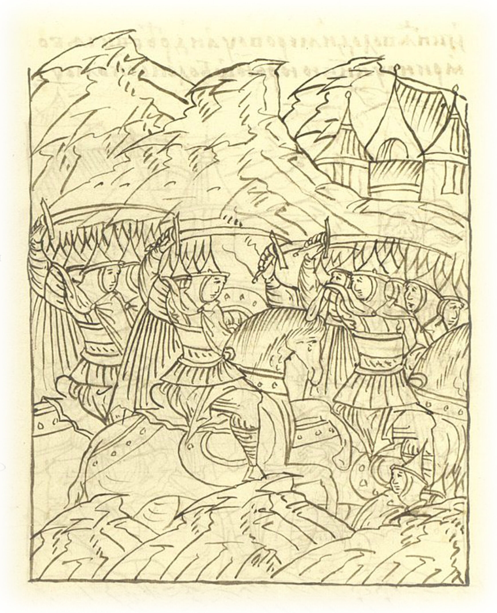 И бились они, и загнали воеводы татар в лес, и разошлись. Живых из них взяли Мырзу Шаболотова, сына княжеского, с товарищами; и на том бою многие с обеих сторон пали и ранены были.