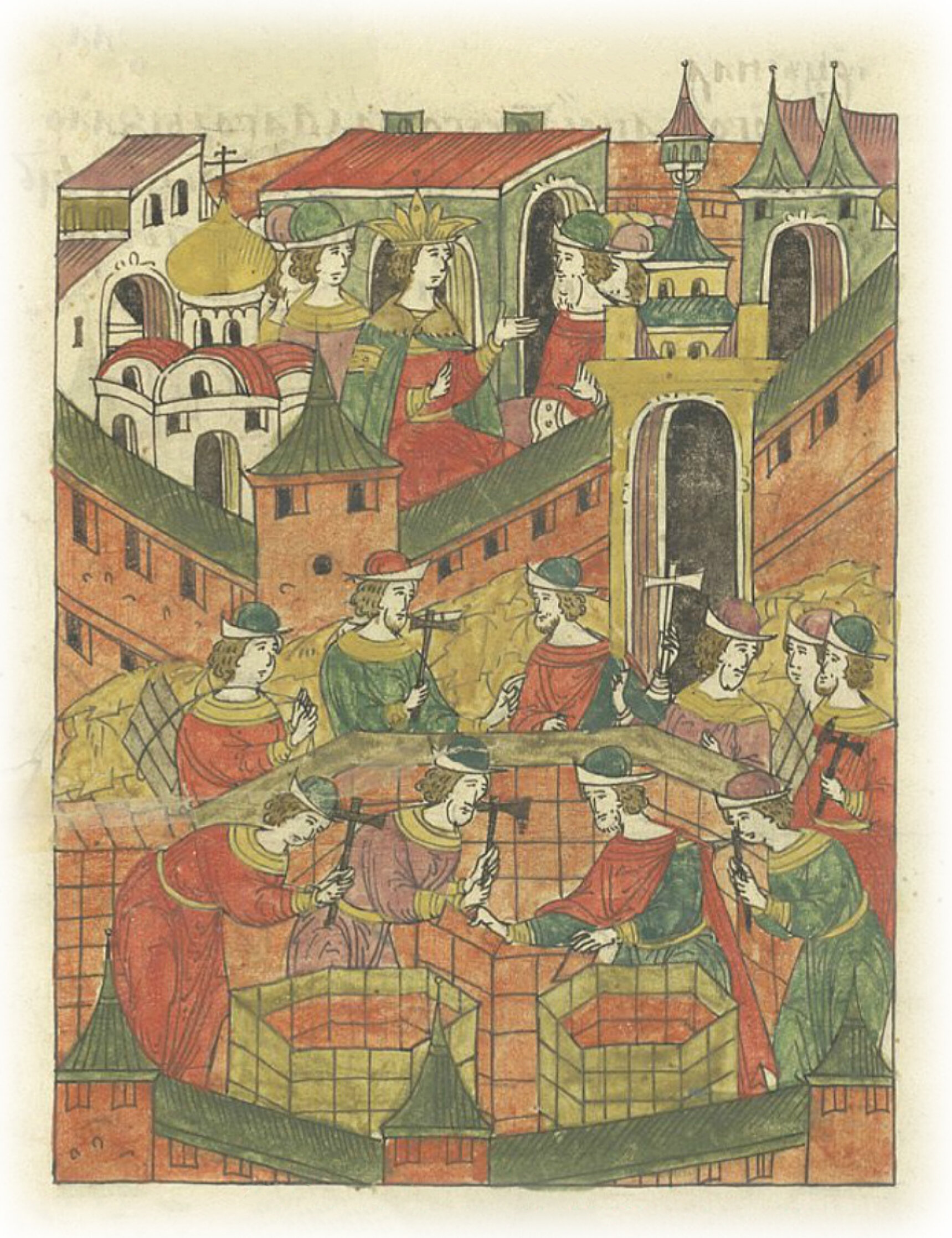О заложении церкви каменной Покрова пресвятой Богородицы. В том же месяце благоверный и христолюбивый царь и великий государь велел заложить церковь каменную Покрова пресвятой Богородицы о девяти верхах, которая была прежде деревянной, о Казанском взятии у Фроловских ворот над рвом, придел к той же церкви живоначальной Троицы надо рвом – Николу чудотворца Вятского; а прежде сего за два года заложена была одна церковь Троицы, и государь велел прибавить к той же церкви Покрова пречистой Богородицы и приделы.