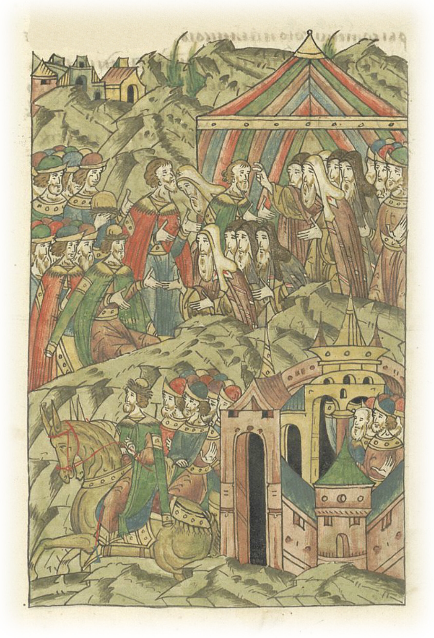 Великий князь Михаил Александрович Тверской с князьями и боярами с почетом встречает Киприана, митрополита всея Руси, за пять верст от города Твери.