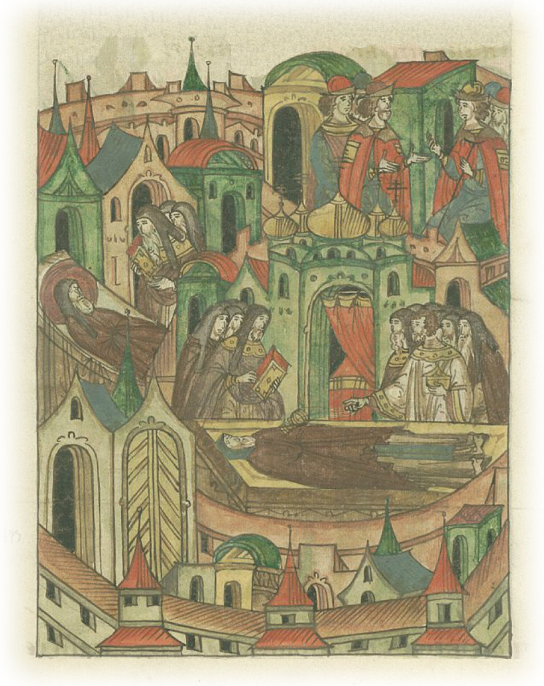 Кончина посла Данило Феофановича и его похороны в монастыре Чуда святого архангела Михаила в Москве.