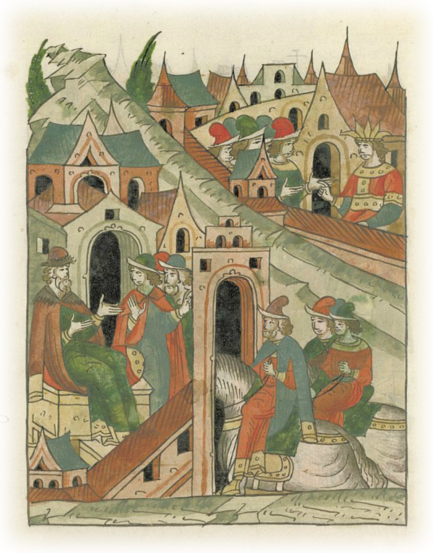 Ругодивские посадники Яким и Захар приезжают в Москву. Воеводы царя Ивана Васильевича Алексей Адашев и Иван Михайлов сообщают им, что государь пожалует их, если сдадут его воеводам помимо Ругодива Вышгород.