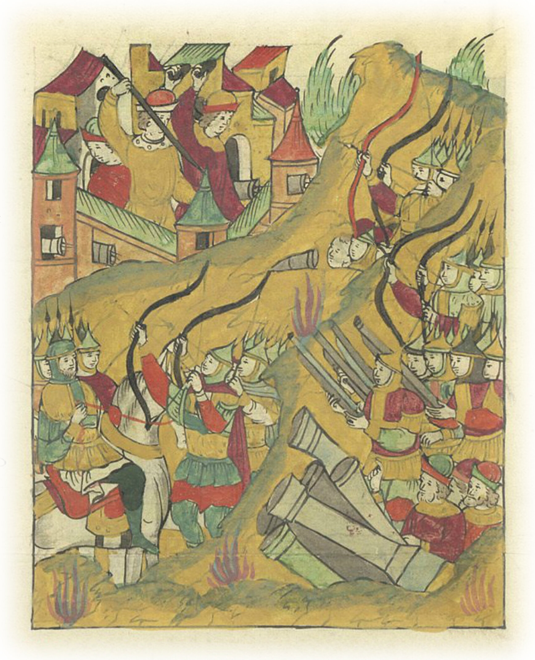 Татары же приступили со всеми полками к городу и из пушек и пищалей начали по городу бить, а стрелы их, как дождь, полетели. И к стенам града приблизились, из города же начали из пушек и пищалей на татар стрелять, а татар, которые к стене приступили, и тех со стен кольями и камнями отбили.