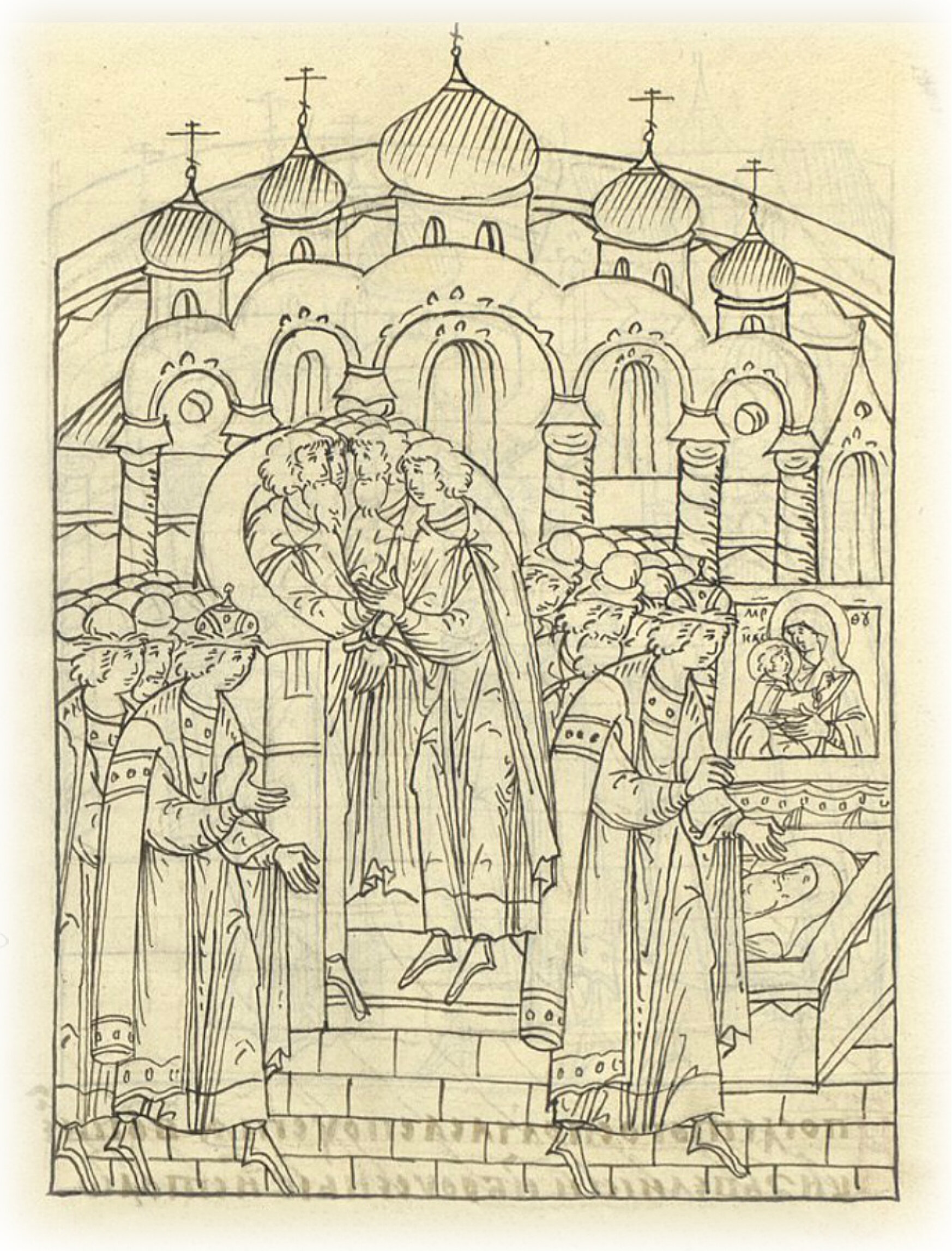 И как вошел великий князь в церковь, то певчие дьяки начали петь великому князю многолетье, а великий князь начал ходить (по храму) молиться и прикладываться к святым иконам и к (мощам) великих чудотворцев.