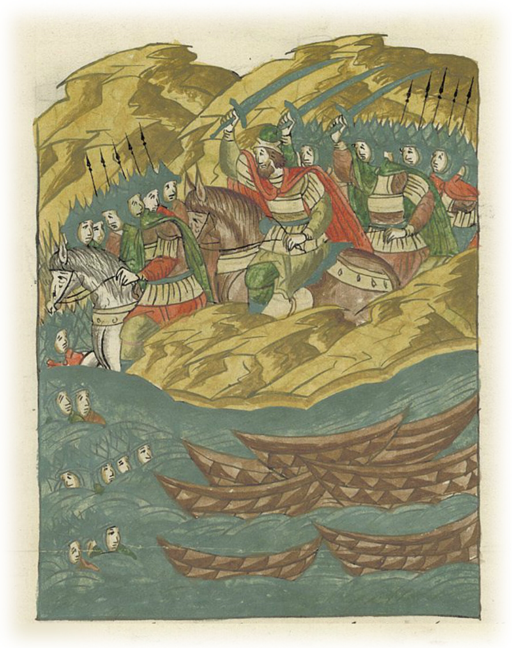 Болгары, испугавшись белозерцев, бегут с поля боя. Белозерцы гонятся за ними, а половцы убегают, около двух тысяч из них тонет.