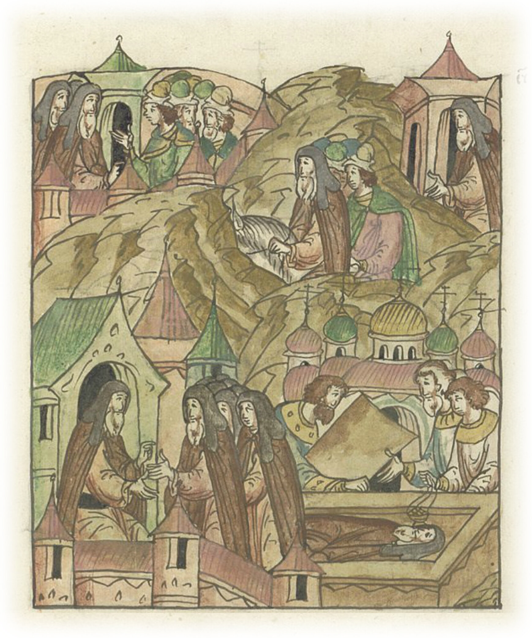 Кончина Новгородского архиепископа Антония и его похороны в притворе церкви святой Софии.