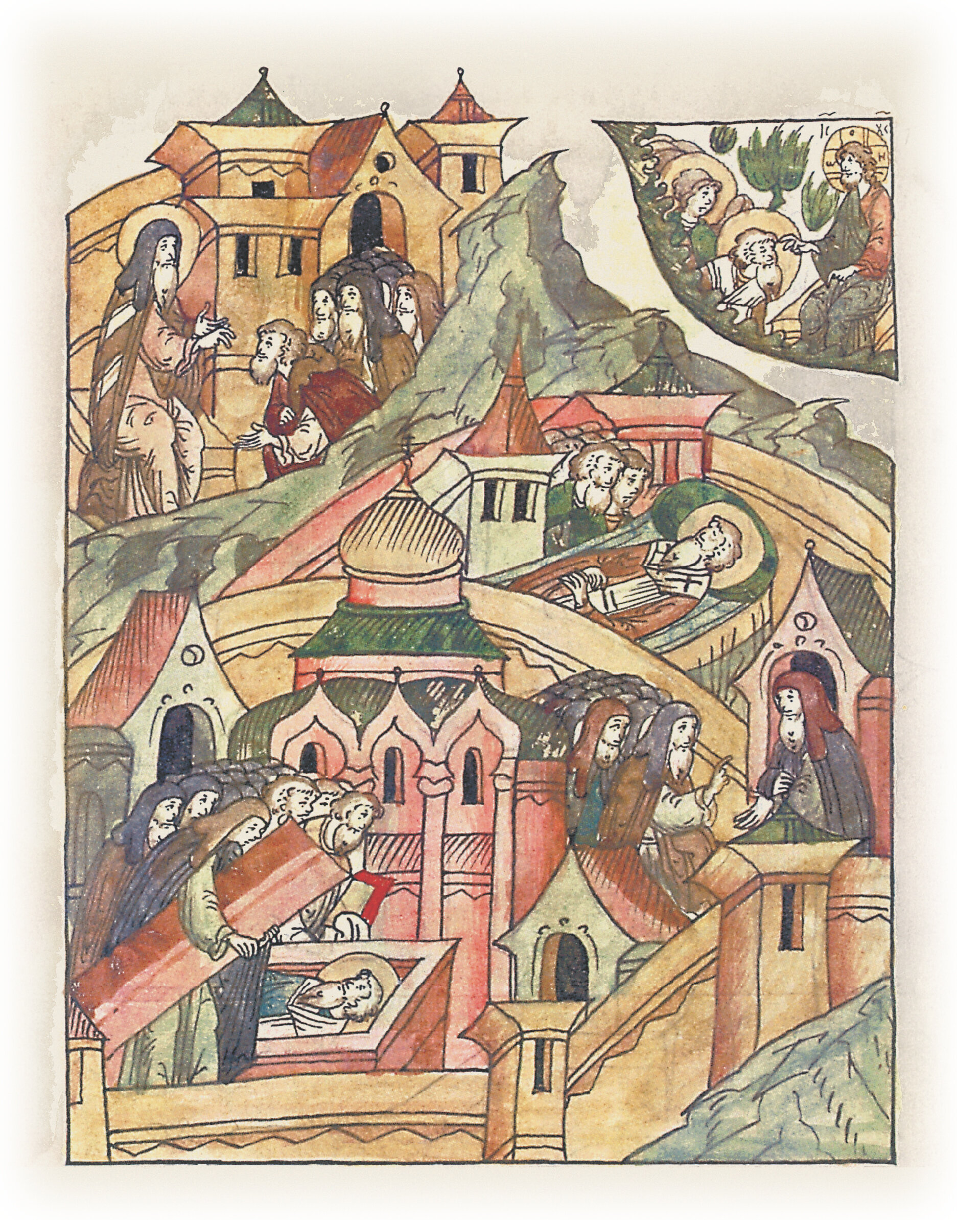 Услышав об этом, благочестивый царь Мануил весьма возрадовался и написал к нему, чтобы и Богомильскую ересь до конца из стада Христова вычистил, а тех, которые не хотят вернуться к соборной церкви, в изгнание послать. Также и манихеев, и армян непокоряющихся, всех святой в изгнание послал и в заточения различные; уверовавших же причислил к своему стаду. И на месте, где соборы творили прежденазванные еретики, сотворил там церковь во имя Святых апостолов, и монастырь поставил, и множество иноков собрал, и всем необходимым обеспечил. И украсил церковь, чья красота многих удивляет и на славославие Божие подвигает, и законы инокам передал, и правила. Предвидя же свое преставление, поставил им игуменом ученика своего Петра и отошел к Господу. И положили его в его монастыре. Когда же минуло много времени, начали некоторые противиться игумену Петру, уклоняясь к древним своим обычаям, вводя раздоры и ереси.