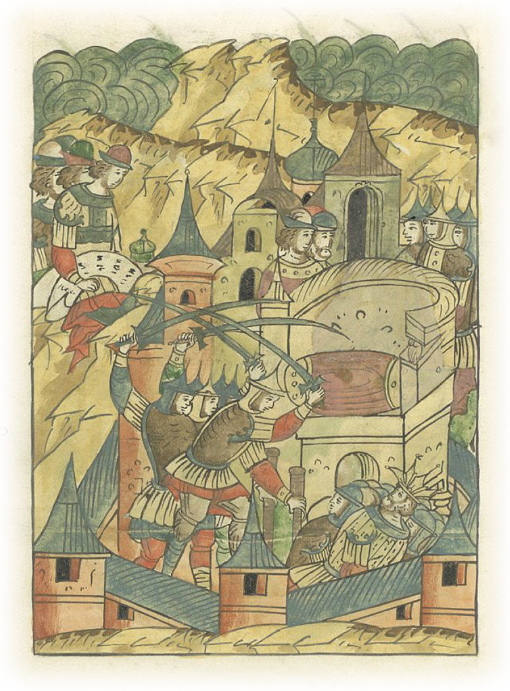 Языки говорят воеводам царя Ивана Васильевича, что магистр окопался большим рвом вокруг города Рындола, бьет из пушек и пищалей и приступает к Рындолу.
