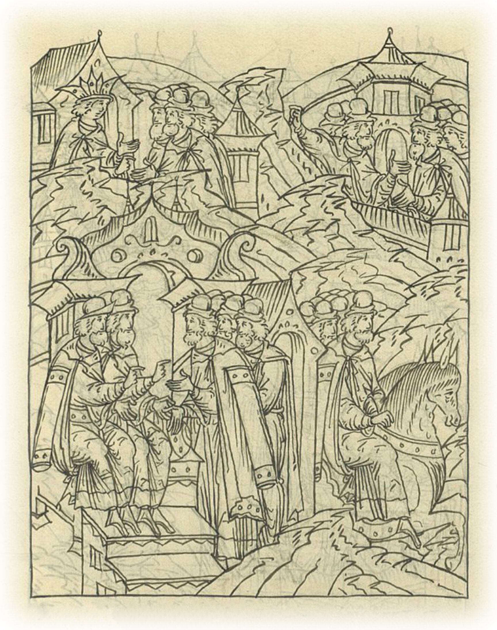 Ругодивские посадники Яким и Захар приезжают в Москву. Воеводы царя Ивана Васильевича Алексей Адашев и Иван Михайлов сообщают им, что государь пожалует их, если сдадут его воеводам помимо Ругодива Вышгород.