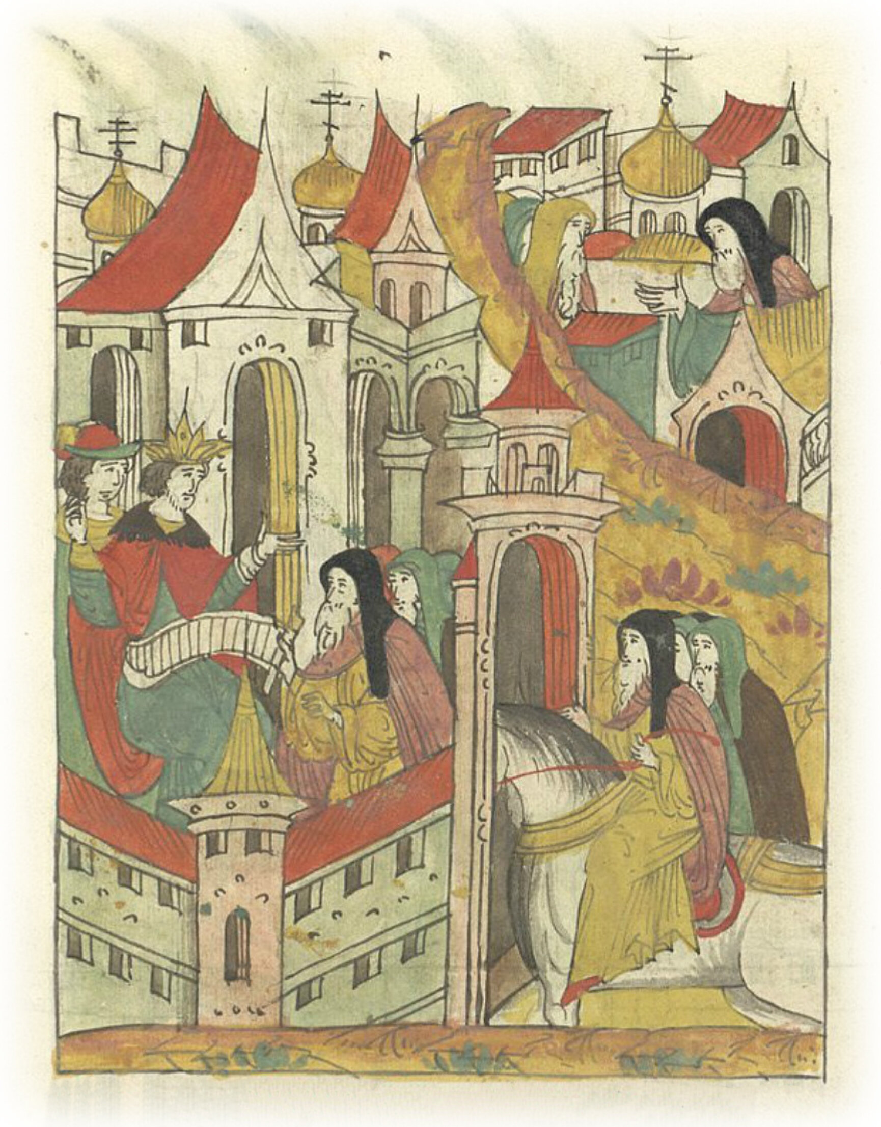 Священник Иоасаф с товарищами приходит к царю Ивану Васильевичу из Александрии от патриарха Иоакима с грамотой о милостыне.