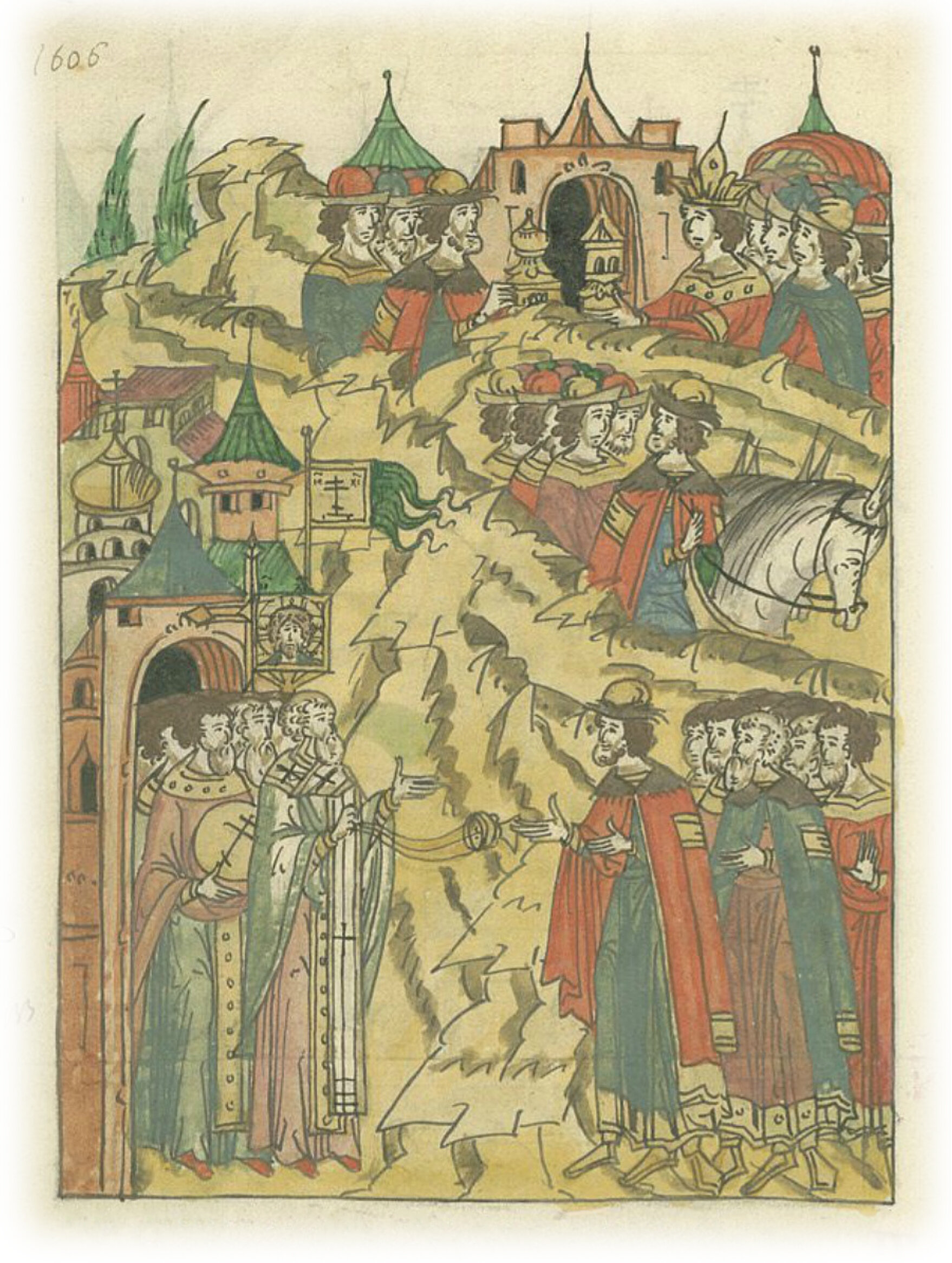 Великий князь Иван Михайлович Тверской приходит в Тверь с почестями и дарами от царя Большой Орды Керим-Бердея.
