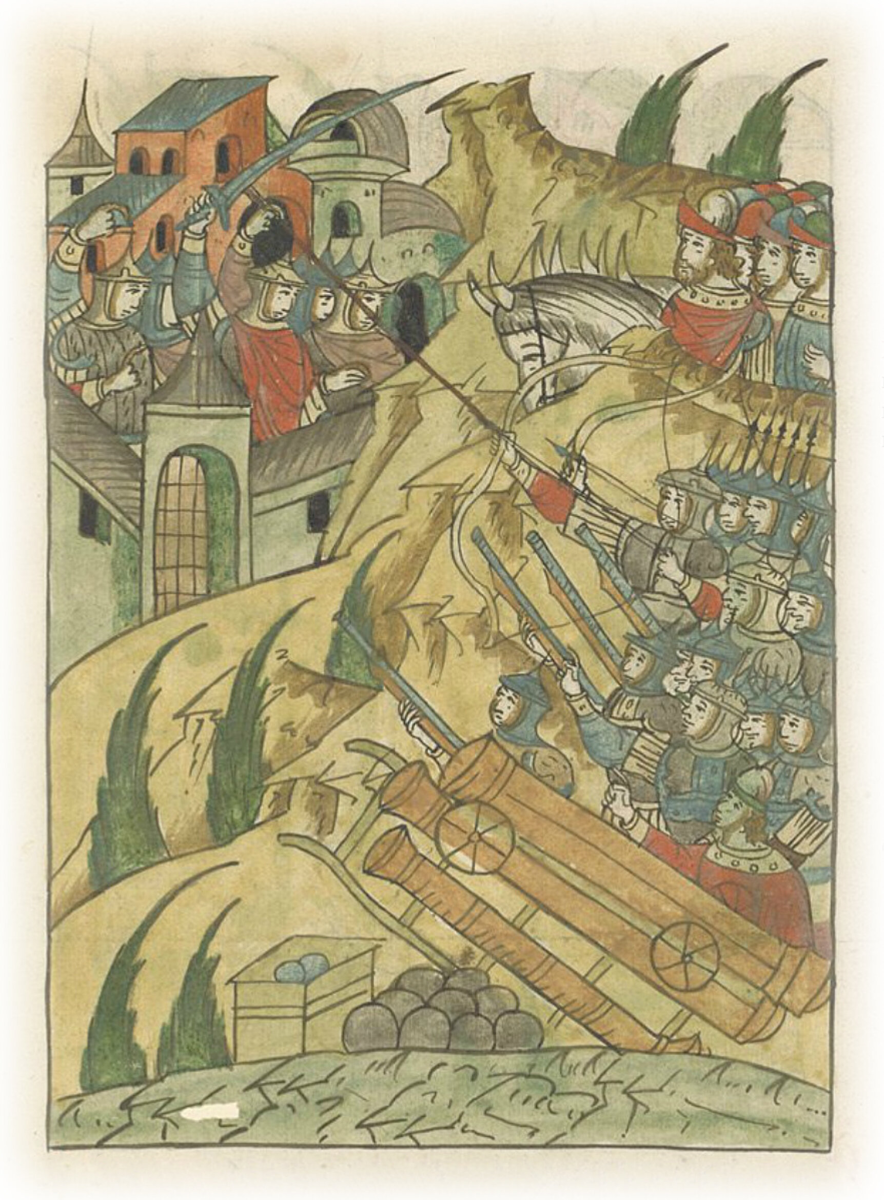 И воеводы великого князя встали около города и повелели по городу из пушек и из пищалей бить.
