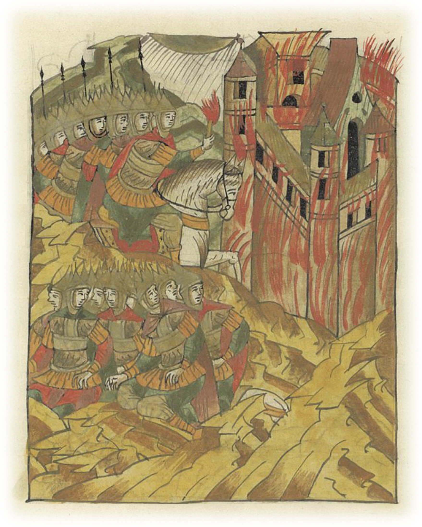 О войне против болгар. Войско Святослава Всеволодовича окружает город и зажигает его. Ветер тянет дым на полки Святослава.