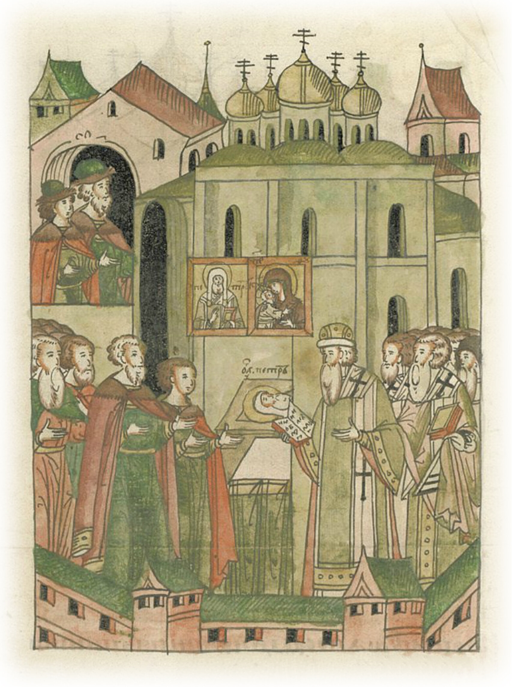 И когда вошел в церковь великий князь с внуком, митрополит со всем собором начал служить молебен Пречистой Богородице и чудотворцу Петру; и после «Достойно есть», «Трисвятого» и тропарей