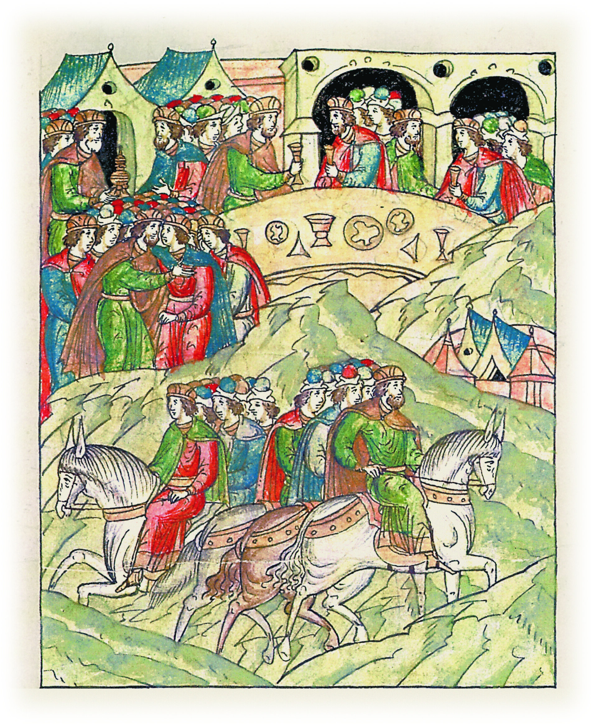 И целовались с любовью о Христе, и много плакали о бедах и о напастях, бывших с ними, и снова утешились, и с любовью почествововали друг друга, и одарившись любезными дарами, разошлись; и пошел Святослав Олегович к Нерильску.