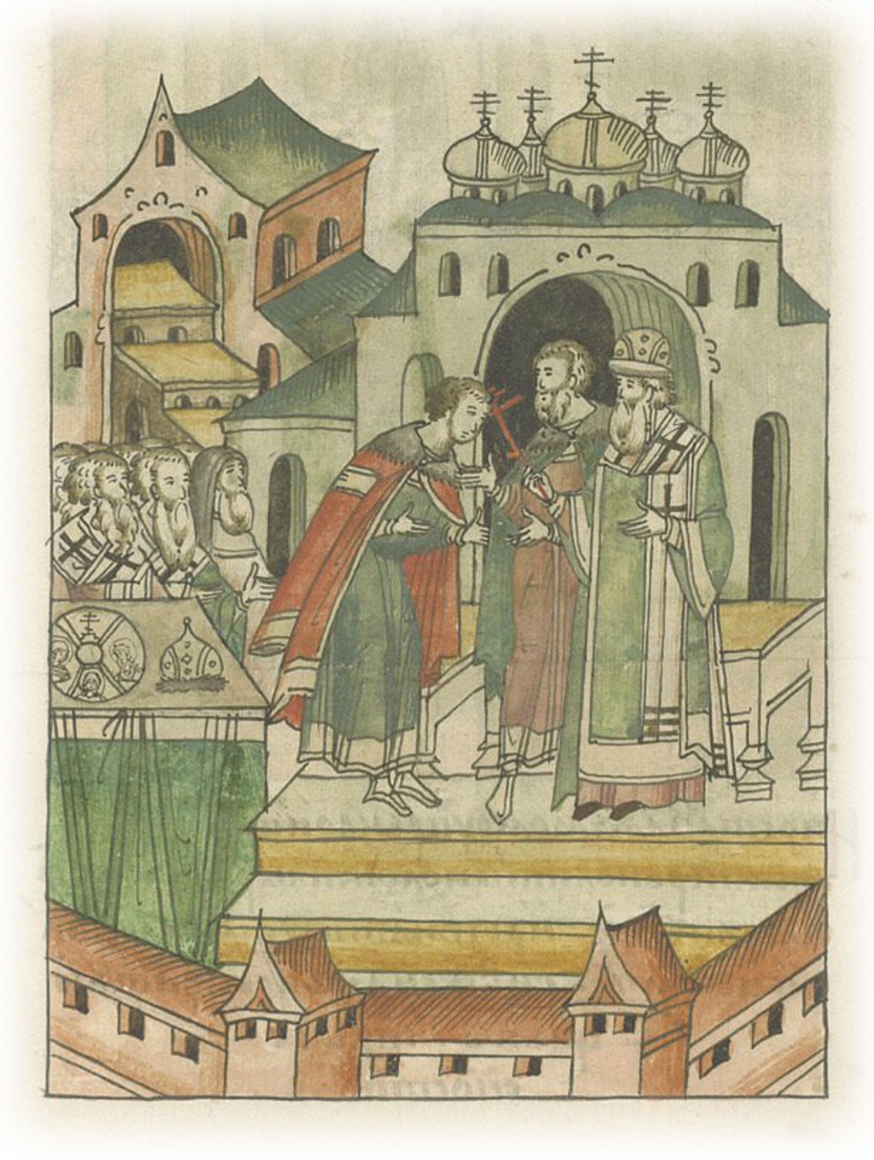 И после речи великого князя повелел митрополит внуку князя подняться на помост и, встав, благословил его крестом;