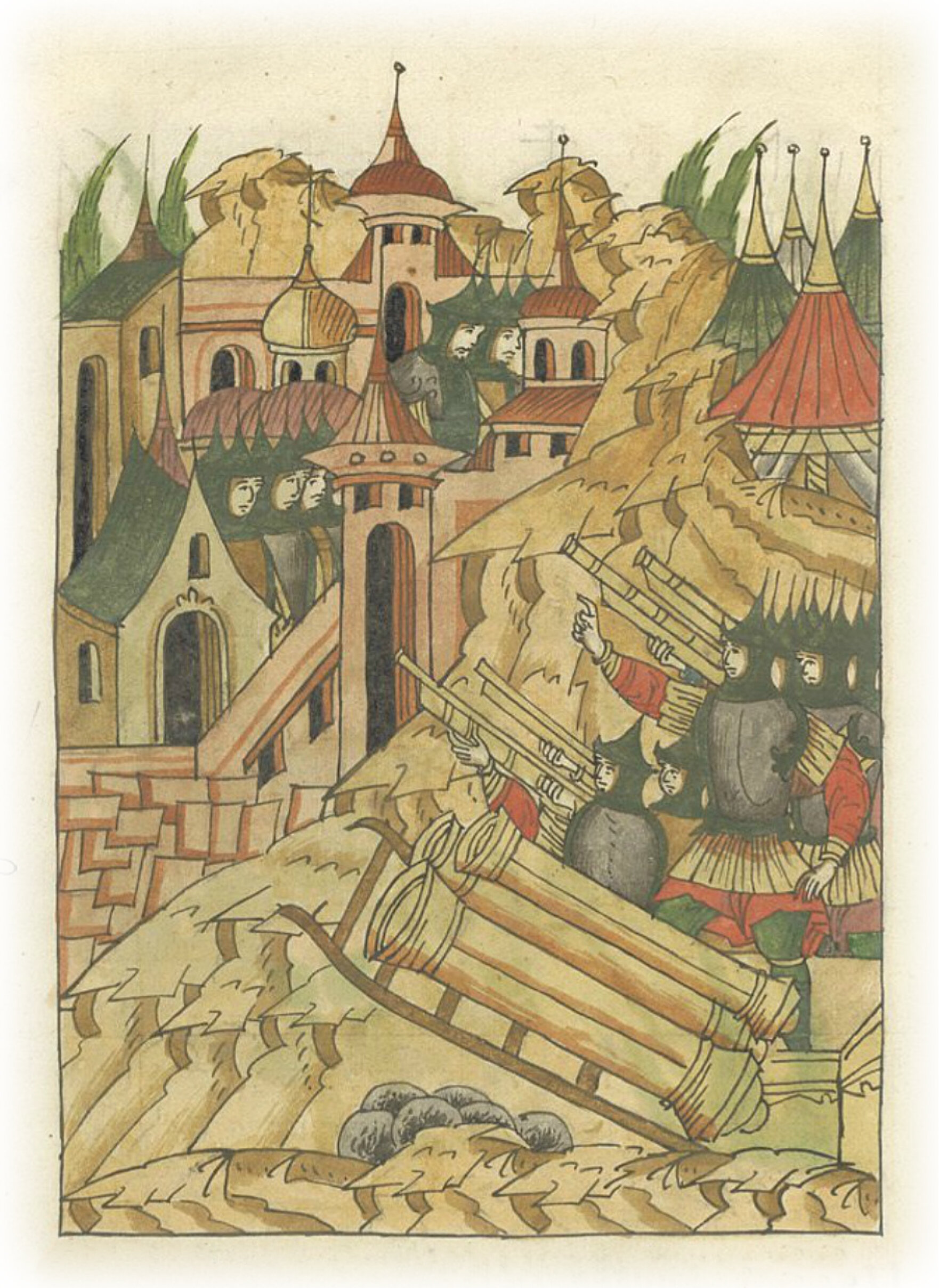 Языки говорят воеводам царя Ивана Васильевича, что магистр окопался большим рвом вокруг города Рындола, бьет из пушек и пищалей и приступает к Рындолу.