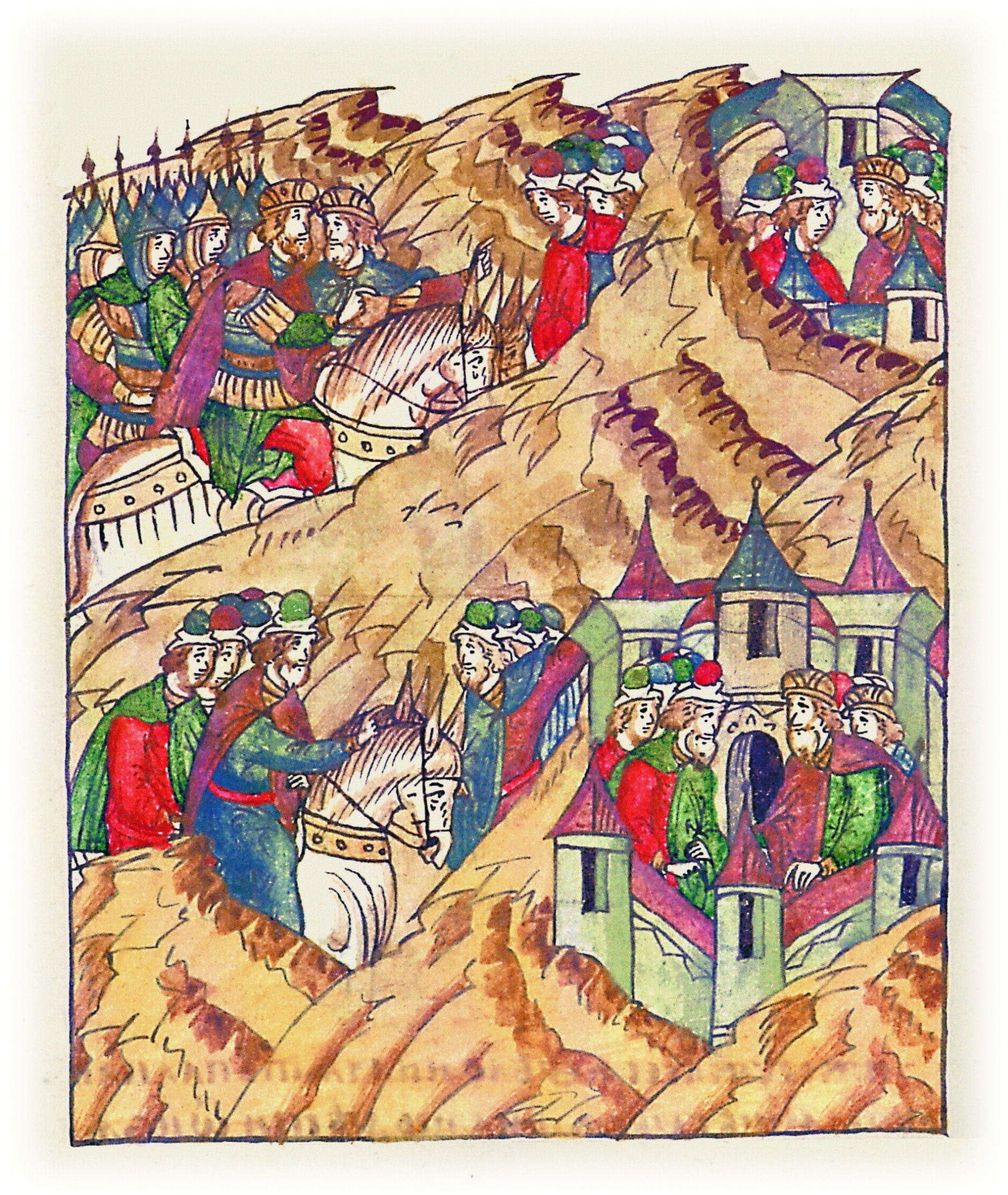 Он же ужаснулся и начал плакать: «Увы мне! Куда мне деться от Изяслава Мстиславича? Куда мне бежать? Не спастись мне от него; воистину (он) враг мне и детям моим». И услышал, что близко (он) и со многою силою бесчисленной грядет на него, понял же и о киевлянах своих, что больше любят того, а также и князя Вячеслава Владимировича Мономаша очень любят за его простоту и желают его у себя видеть на великом княжении в Киеве; и, встав, побежал из Киева, и пошел в Городец.