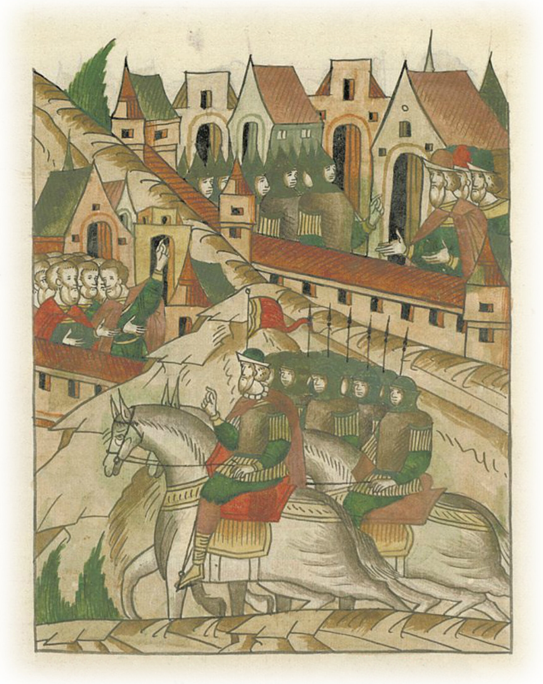 Языки говорят воеводам царя Ивана Васильевича, что магистр окопался большим рвом вокруг города Рындола, бьет из пушек и пищалей и приступает к Рындолу.