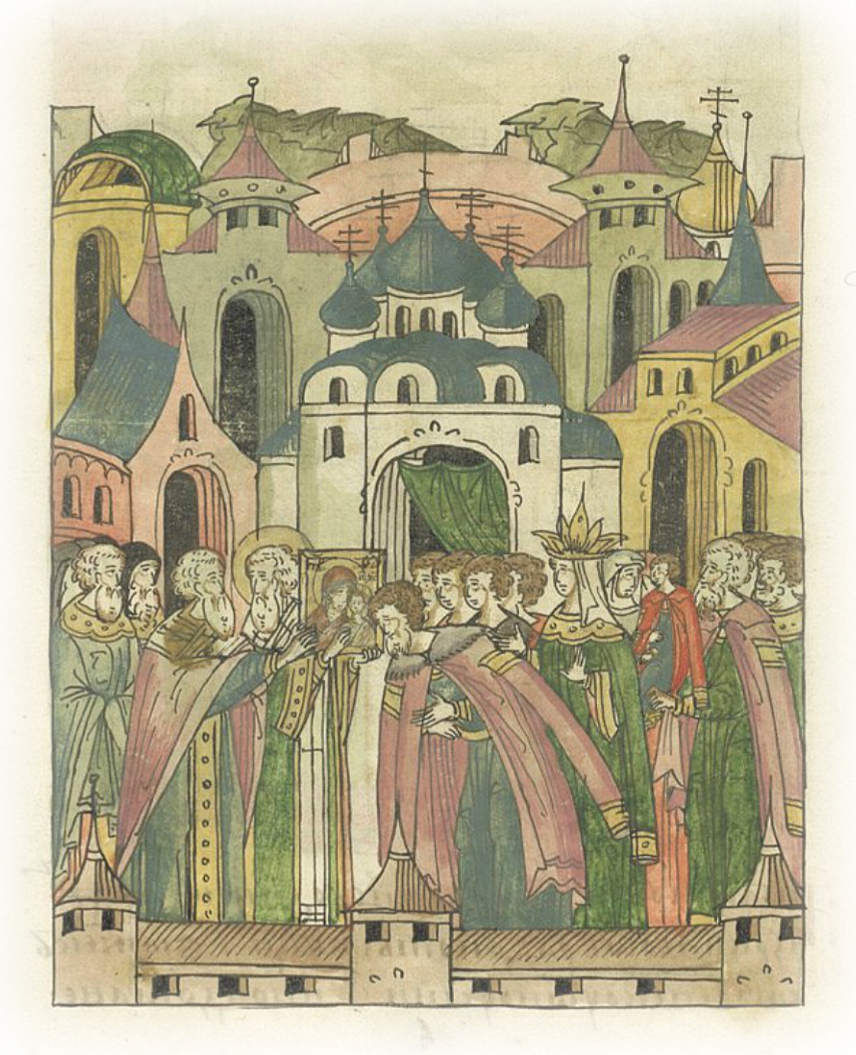 И митрополит призвал епископа, они оба взяли ее в руки, и перекрестили ею великого князя и княгиню его, и благородных чад их, и дали ее в руки великому князю. Великий же князь принял образ пресвятой Богородицы, поцеловал ее со слезами
