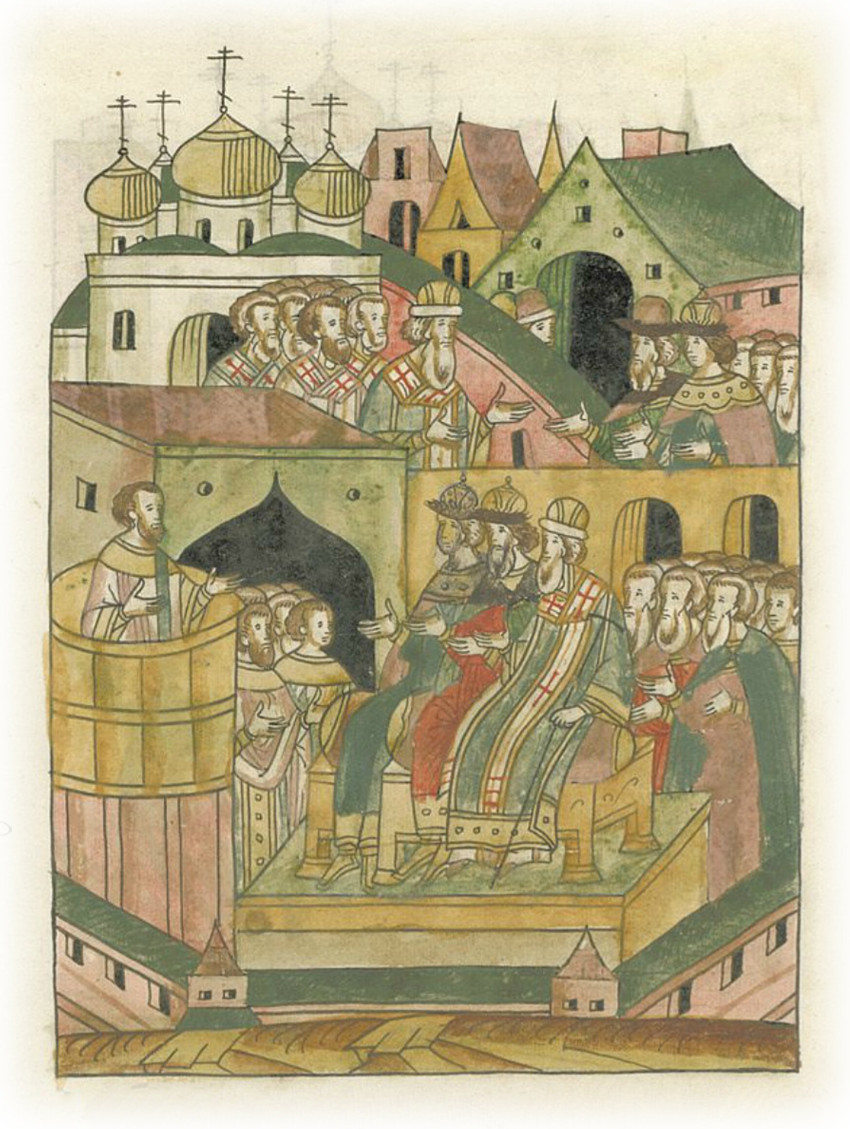 После молитвы сел митрополит и великие князья на свои места, и, взойдя на амвон, архидиакон провозгласил громогласно многолетие великому князю Дмитрию; и священники в алтаре, и дьяки пропели многолетие по обычаю. И после многолетия митрополит и архиепископ, и епископы, и весь собор, встав, поклонились и поздравили обоих великих князей. И сказал митрополит великому князю Ивану: «Божьею милостью радуйся и здравствуй, православный царь Иван, великий князь всея Руси, самодержец со своим внуком великим князем Дмитрием Ивановичем всея Руси на много лет».