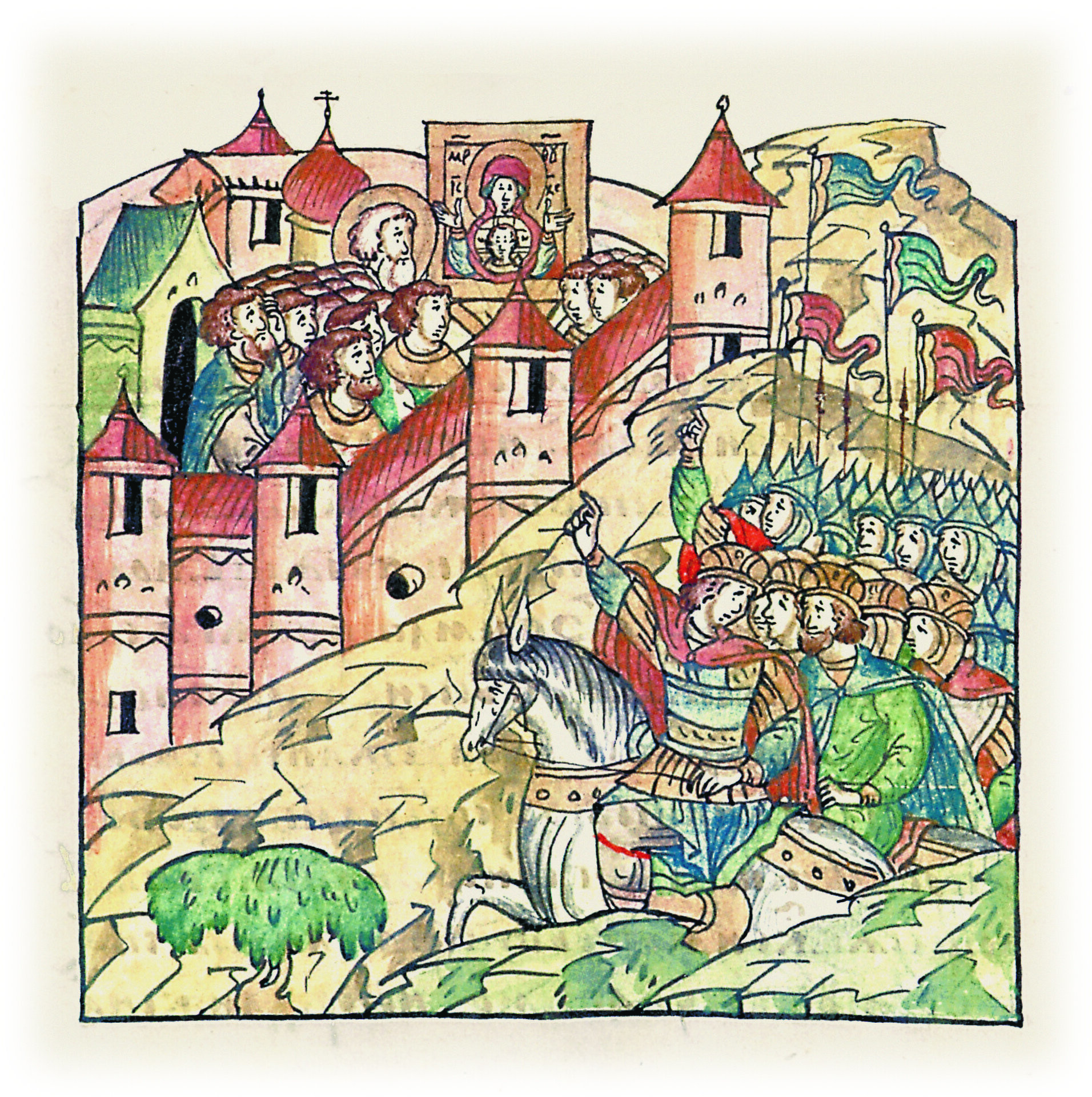 Новгородцы возносят икону святой Богородицы на острог.