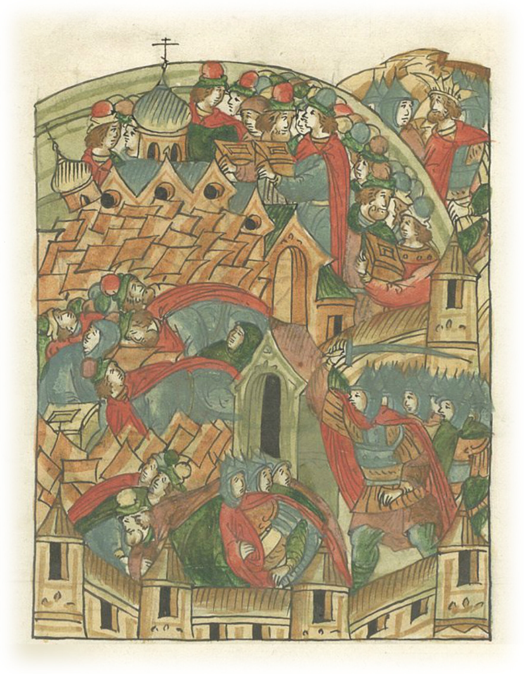 и взбежали на церковные закомары со своими пожитками, и от тяжести повалились церковные стены.