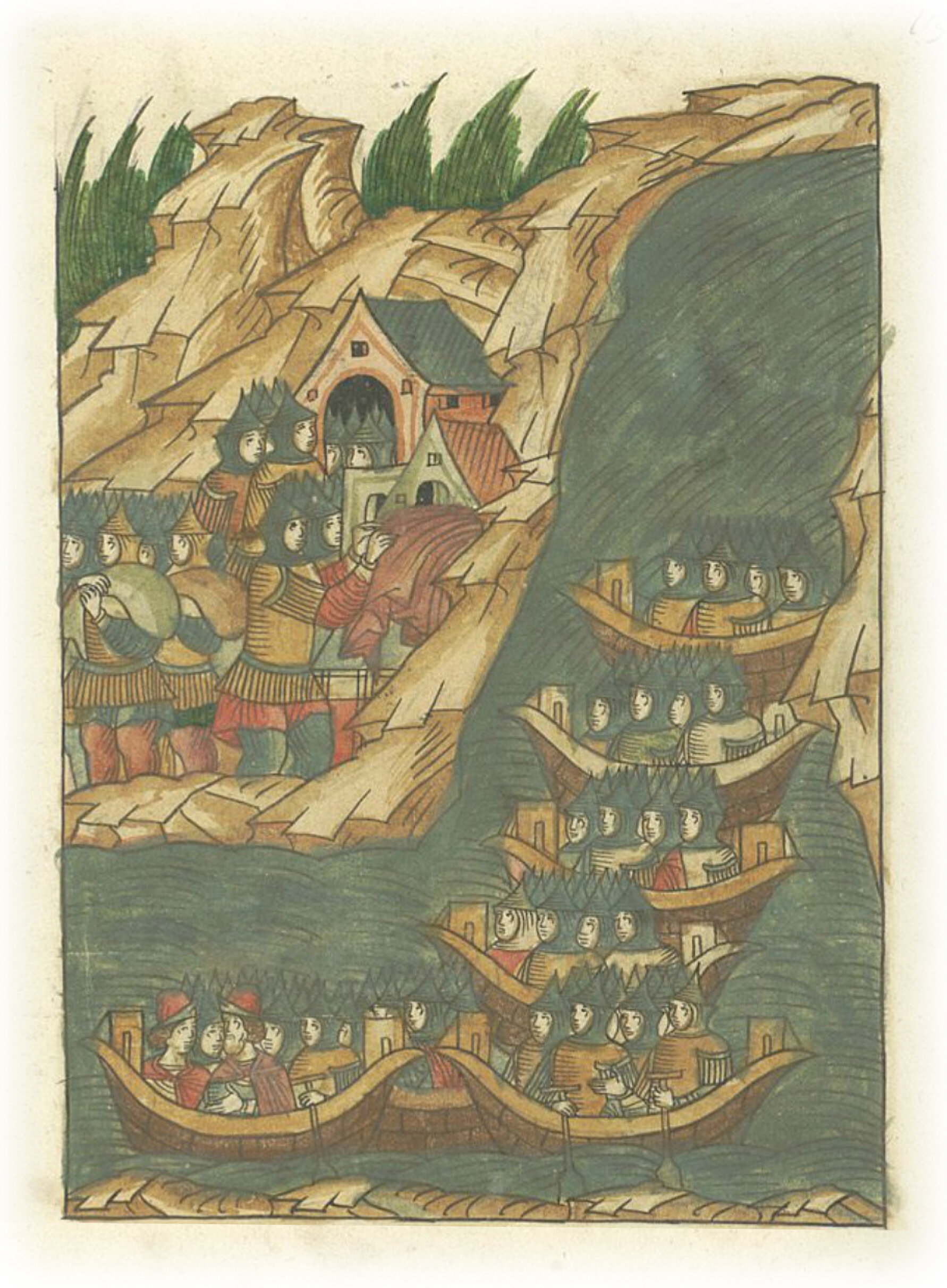 Новгородские разбойники, разграбив Нижний Новгород, идут низом Волги на Каму, по пути совершая грабежи.