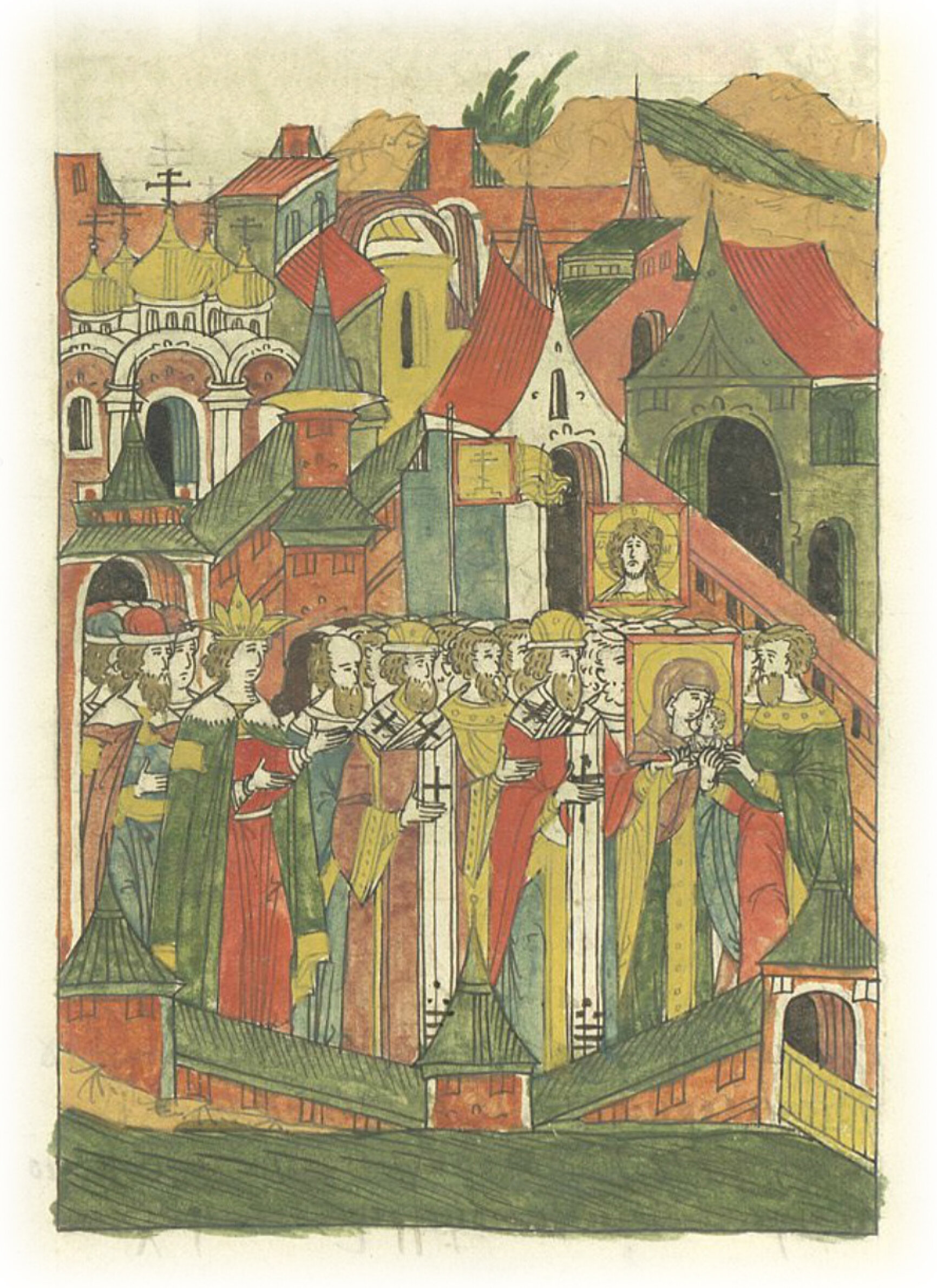 Царь Иван Васильевич и митрополит Макарий отпускают иконы и владыку Гурия в Казань и Свияжский город. Царь провожает иконы и владыку за Фроловские ворота.