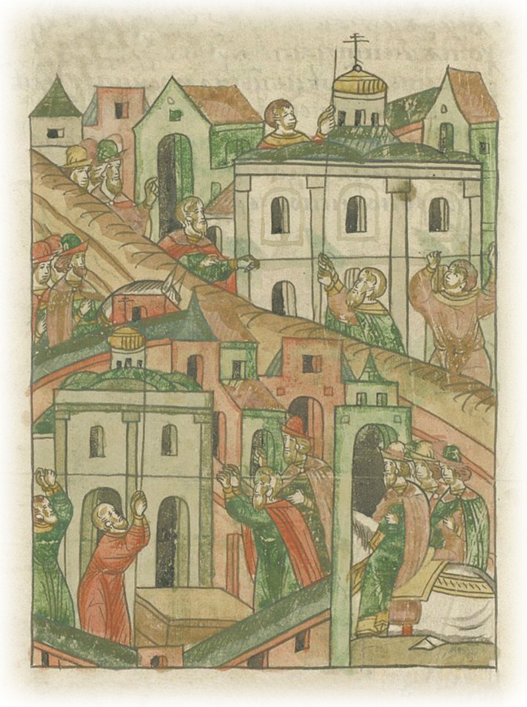 Они же, пойдя туда, увидали храм Пречистой, удивились красоте здания его, и величине, и высоте его; и, измерив ширину и высоту его и алтаря, возвратились в Москву. И обмерили пространство около церкви, которая на Москве,