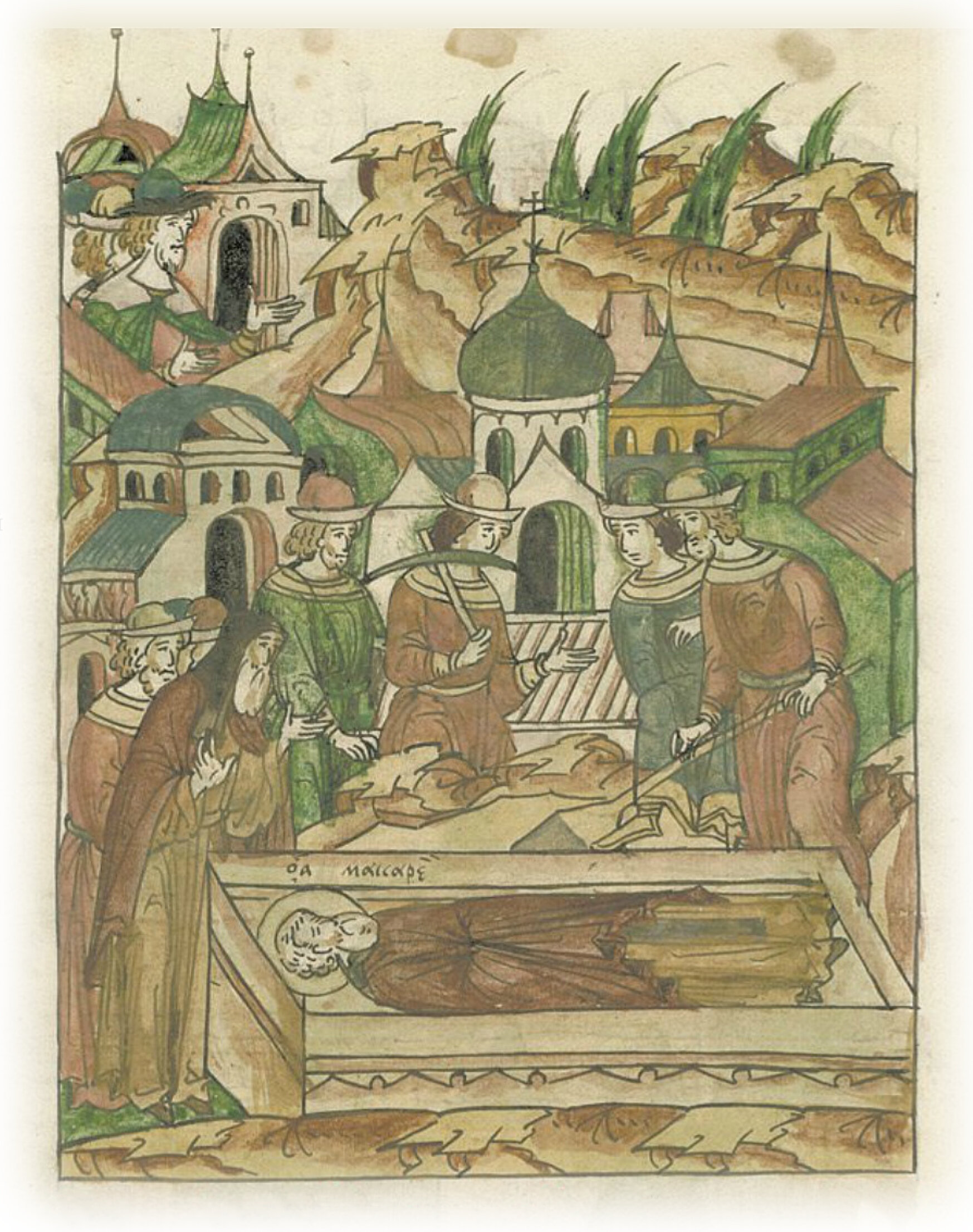 Об обретении (мощей) Макария Калязинского. В том же году (месяца) мая в 14 день в вотчине благоверного князя Георгия Ивановича Московского, в Кашине, в Калязине монастыре, начали копать рвы для основания церкви святой и живоначальной Троицы и обрели мощи преподобного игумена Макария, положившего начало месту тому, целыми и неповрежденными, и ризы его не истлели; и, увидев и удивившись, прославили Бога, прославляющего святых своих.