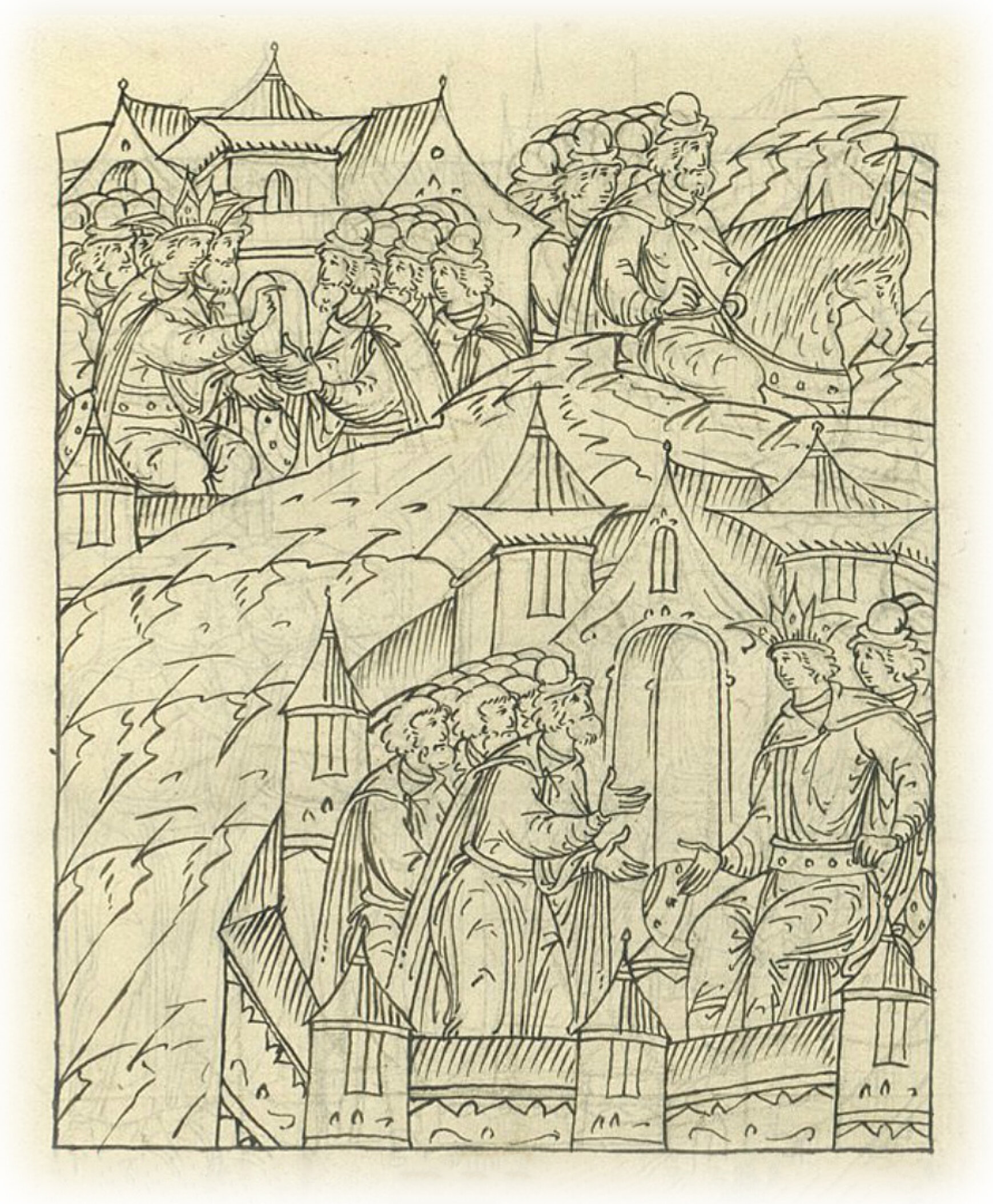 Ругодивские посадники Яким и Захар приезжают в Москву. Воеводы царя Ивана Васильевича Алексей Адашев и Иван Михайлов сообщают им, что государь пожалует их, если сдадут его воеводам помимо Ругодива Вышгород.