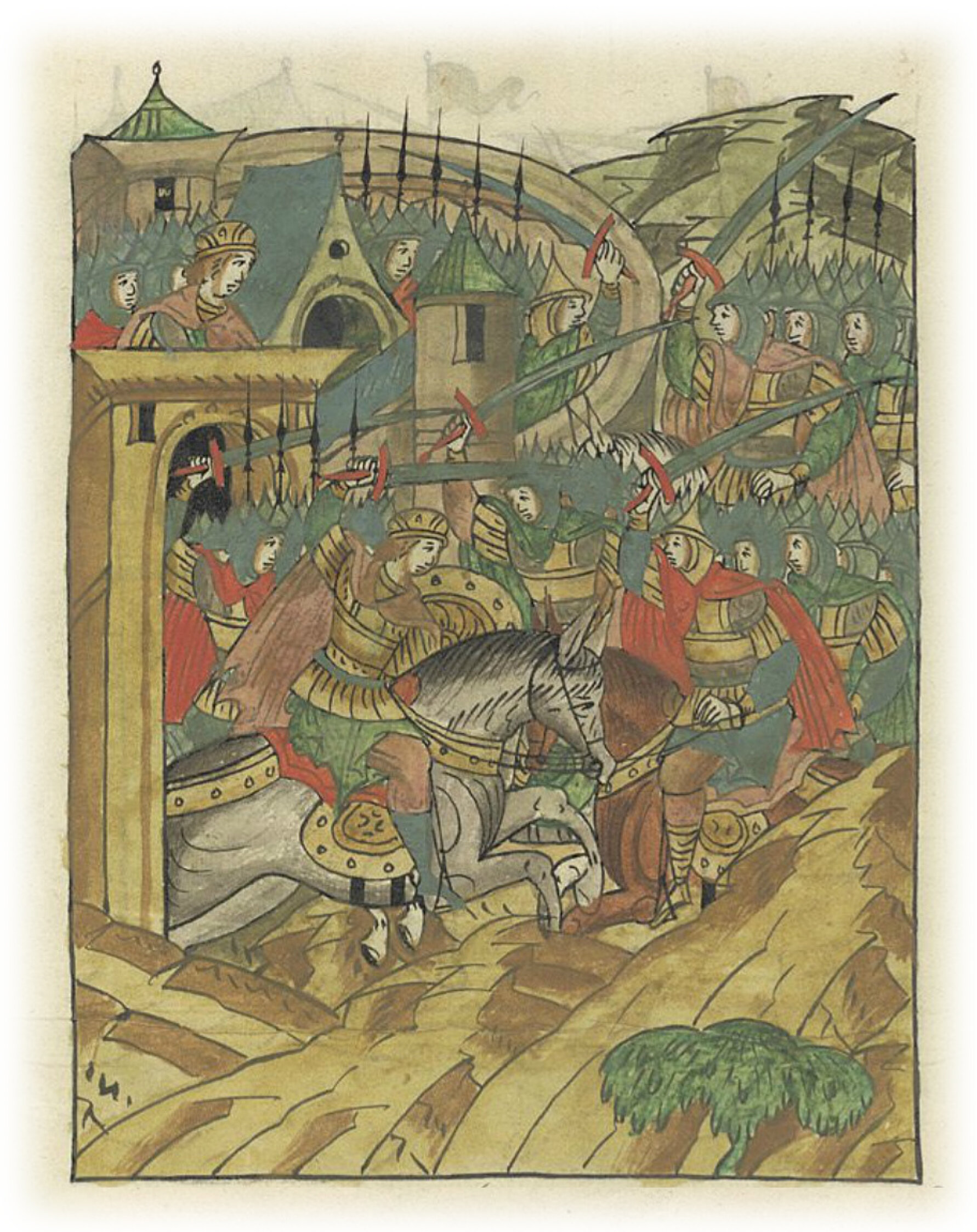Битва с половцами у Переяславля. Половцы в течение дня бьются у Переяславля. Князь Владимир Глебович, видя, что половцы могут взять острог, выходит к ним из города с небольшой дружиной и отважно бьется с ними, но князя окружают.