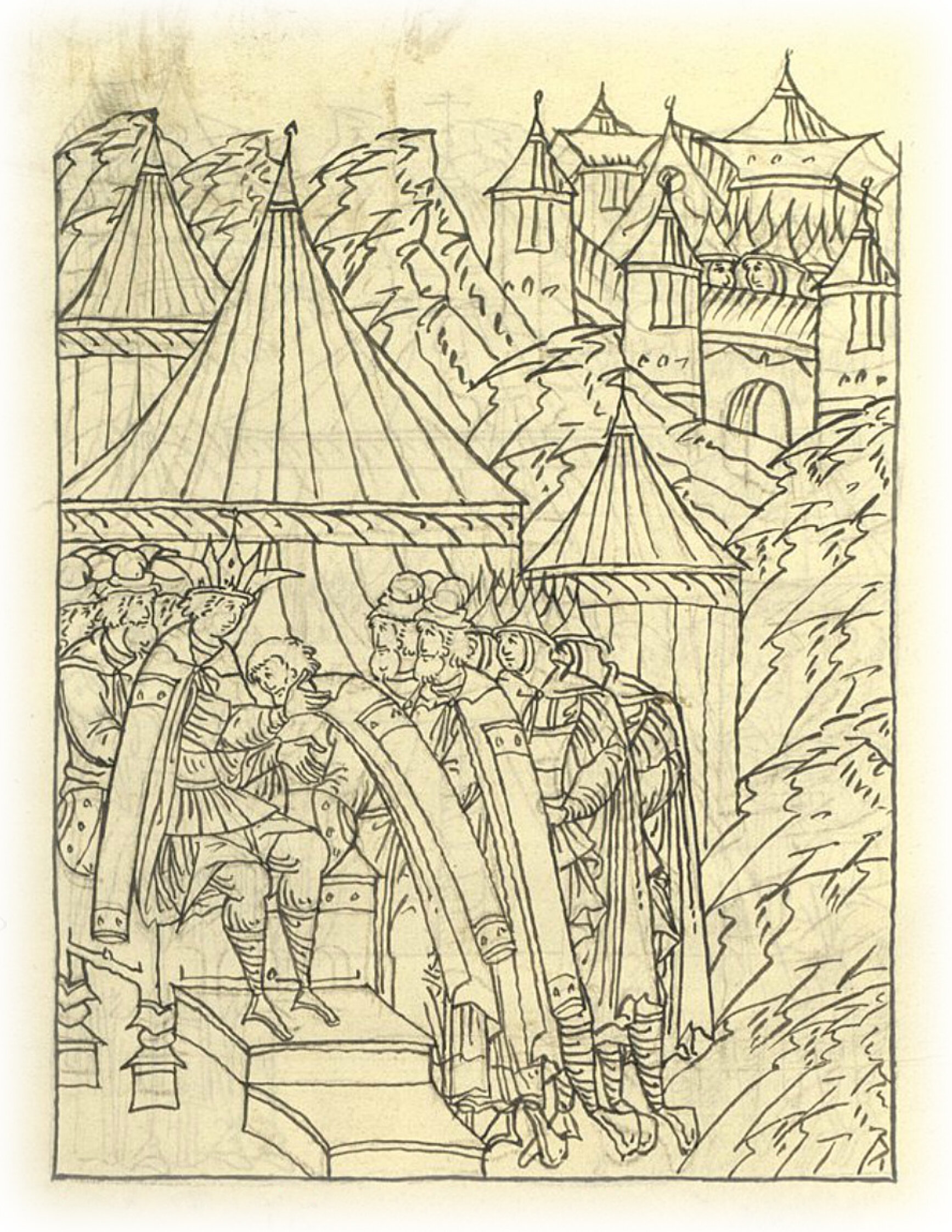 О передвижении тур ко рву. Воевод же своих любезно обнимает и к целованию руки своей допускает, и жалованными словами великими увещевает, храбрость и мужество их чествует; также и всех по чину воинов своих государь жалует.
