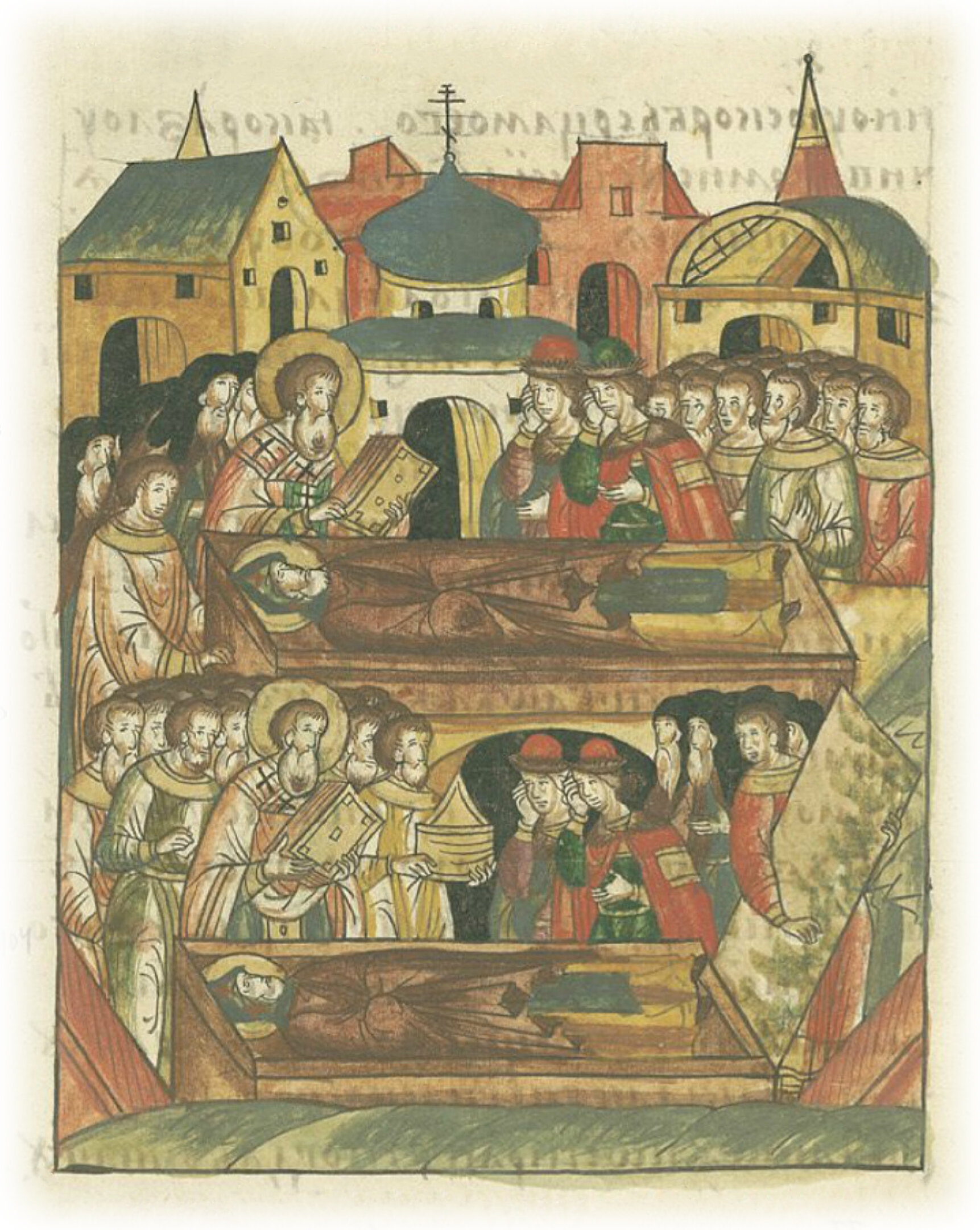Принесли и поставили в соборной церкви на ложе тело его, и не было слышно пения из-за сильного плача. Так, с обильными слезами пропели над ними надгробные песни, отдав конечное целование, и по обычаю благословив, и дав ему отпущение грехов, погребли в великой соборной церкви святого Спаса на правой стороне.
