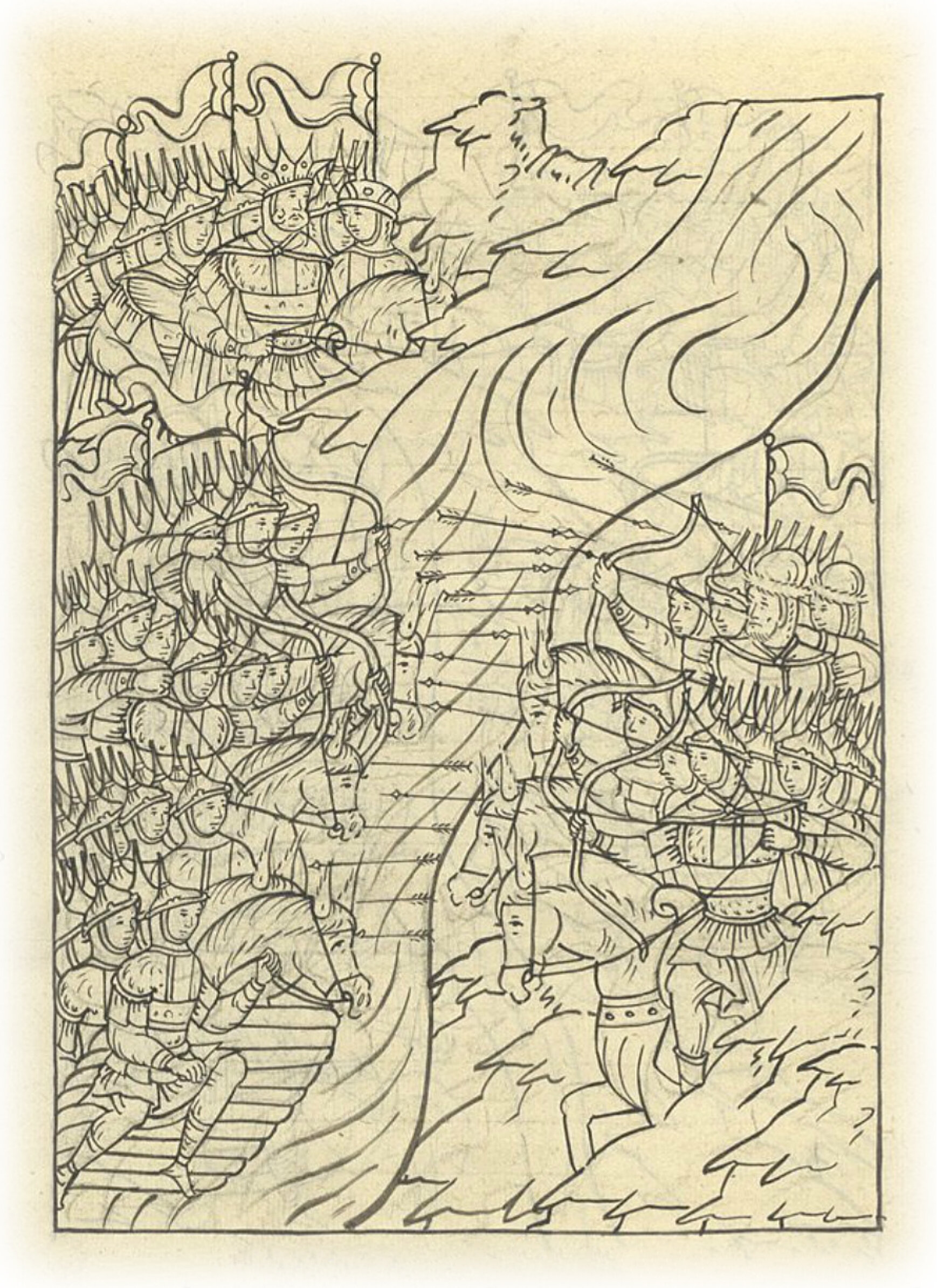 Татары же, видя передовой полк, думали, что это все люди, и пришли зря на берег со многими людьми, и в реку побрели, и на тары начали садиться; а на передовой полк начали стрелять многими стрелами, и полетели стрелы, как дождь.