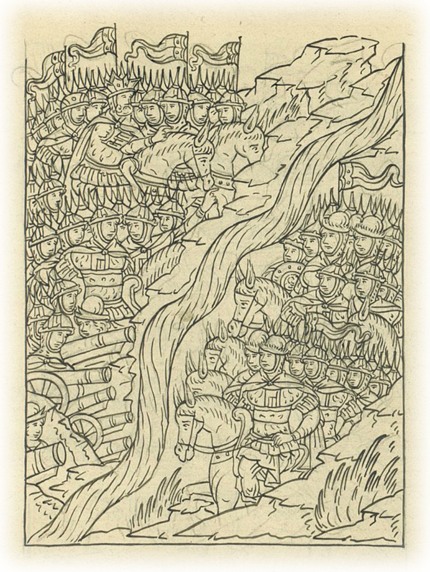 Крымский царь Саип-Гирей велит бить по передовому отряду великого князя из пушек и пищалей, чтобы перебраться за реку. На помощь передовому отряду приходят князья Семен Иванович Пунков Микулинский и Василий Семенович Серебряный Оболенский с полком и вста
