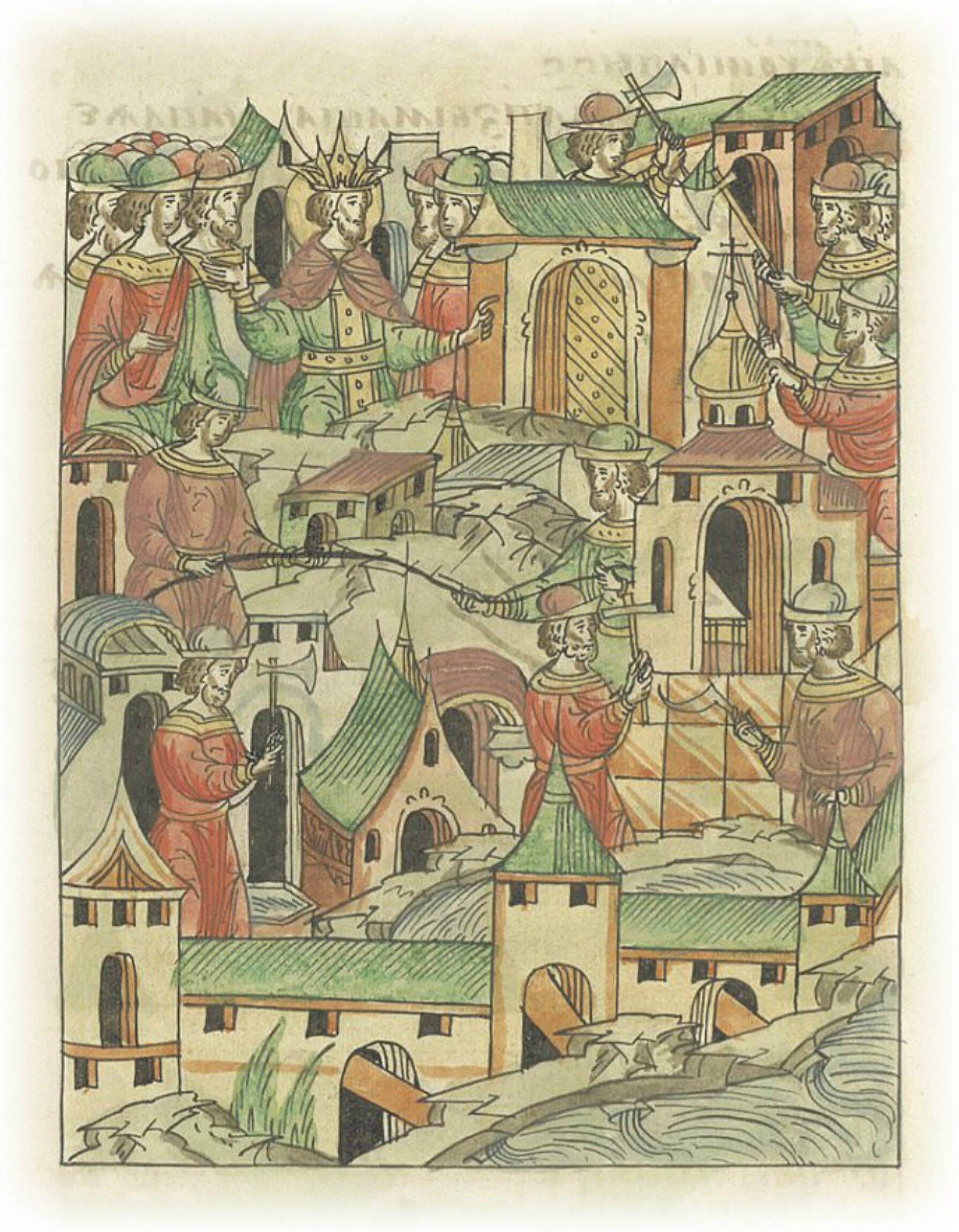 а другим повелел размерить улицы и площади по римскому обычаю. И так начали строить церкви Божии, и двор царский, и иные дома славным вельможам и мегистанам, и всем сановникам; и воды сладкие проводить.