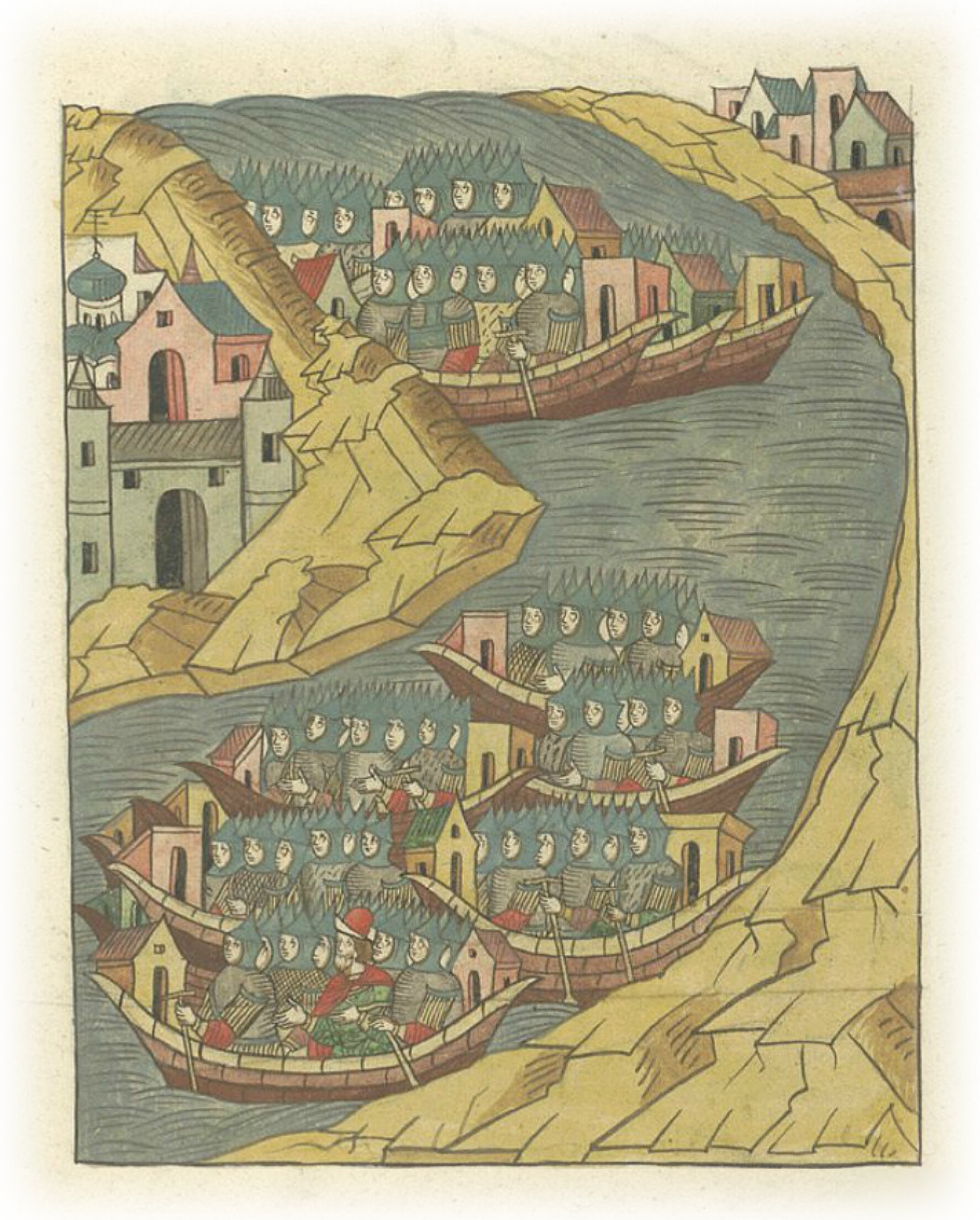 Разбойники из Великого Новгорода на двухста судах идут вниз по реке Волге.