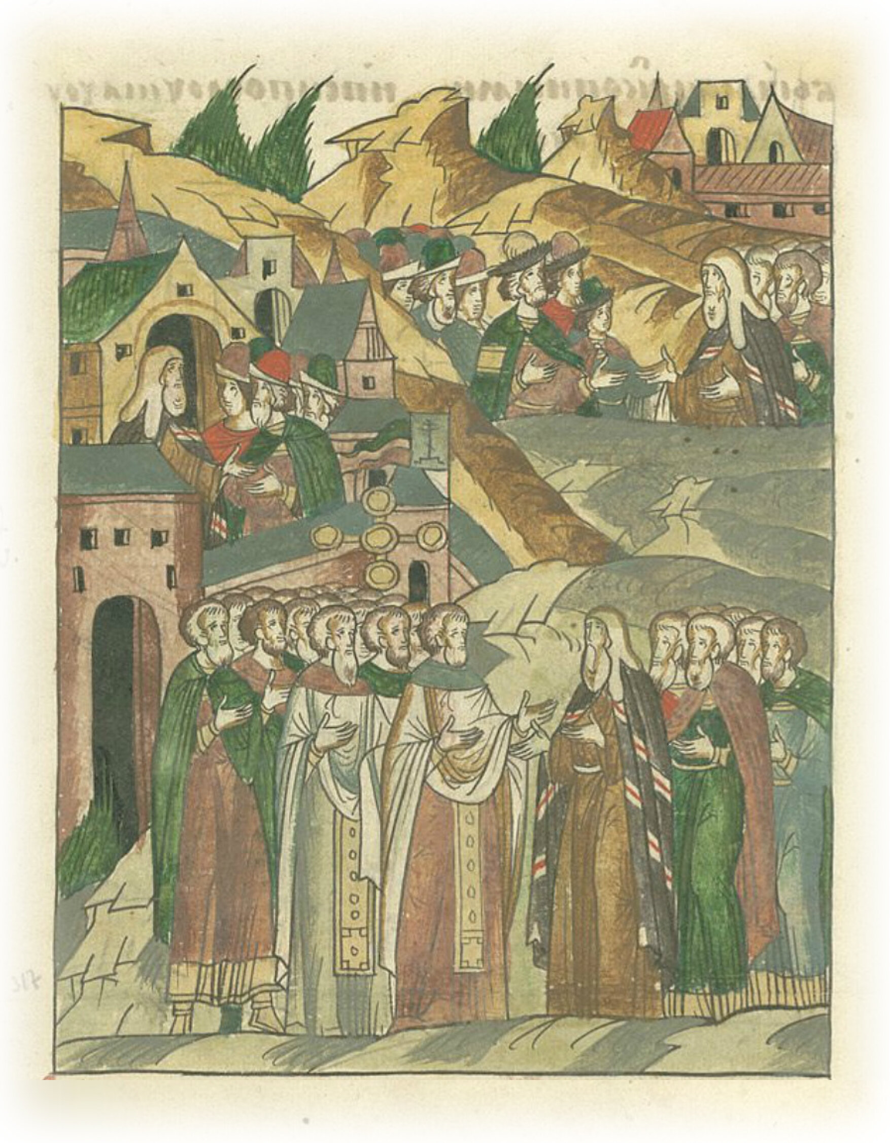 Он же пришел из заточения на Москву, и встретил его священный собор с крестами, а сам князь великий встретил его далеко за городом с детьми своими, и с боярами, и со множеством народа с честью и с любовью.