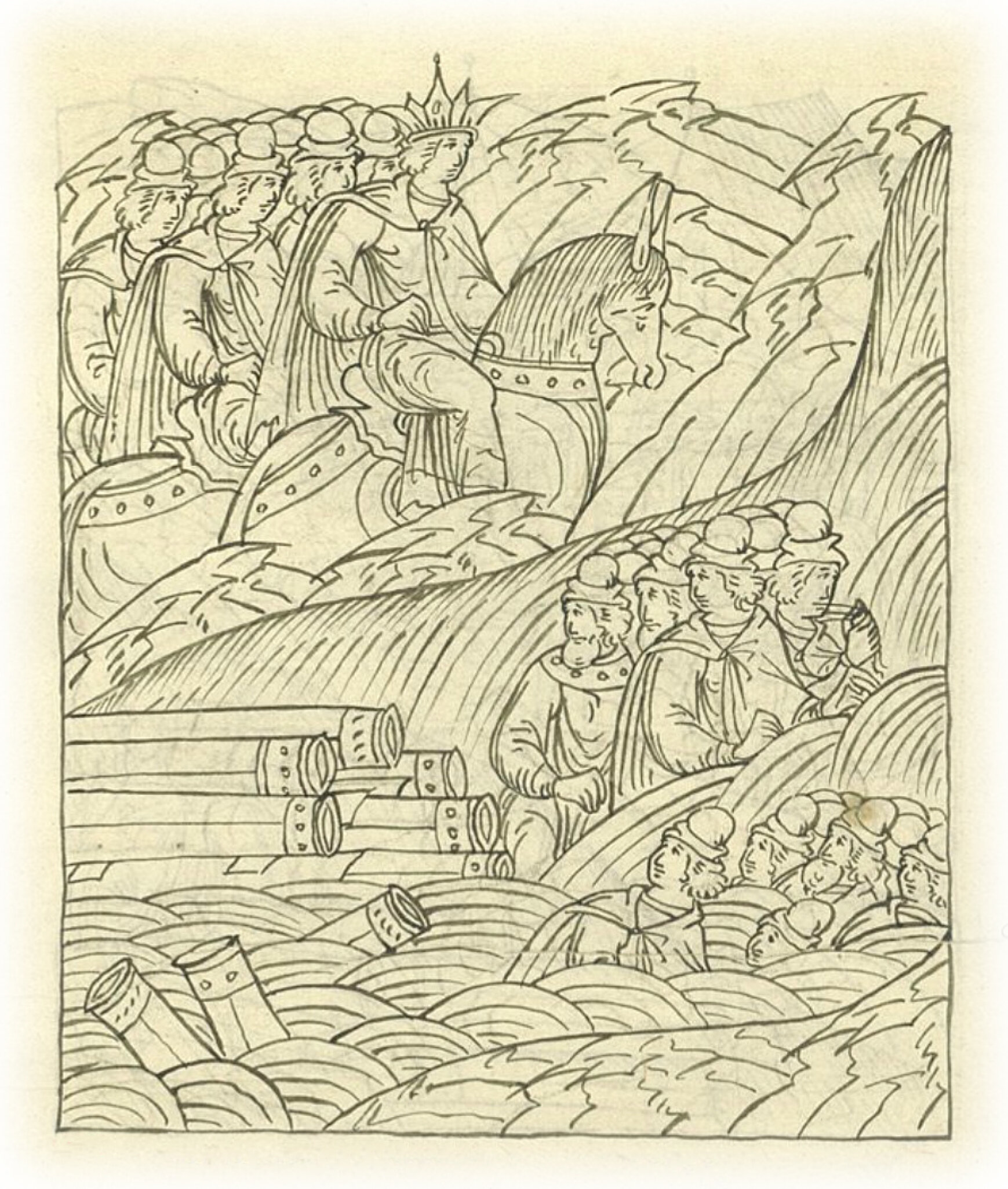 а назавтра, в пятницу пришел на остров Роботку. И Божьей волей наступила великая теплота и мокрота, и покрыла вода весь лед на Волге, и многие пушки и пищали проваливались в воду, так как на лед выступило много речной воды. И по льду никому невозможно было пройти, и многие люди утонули в полыньях, потому что их не было видно под водою.