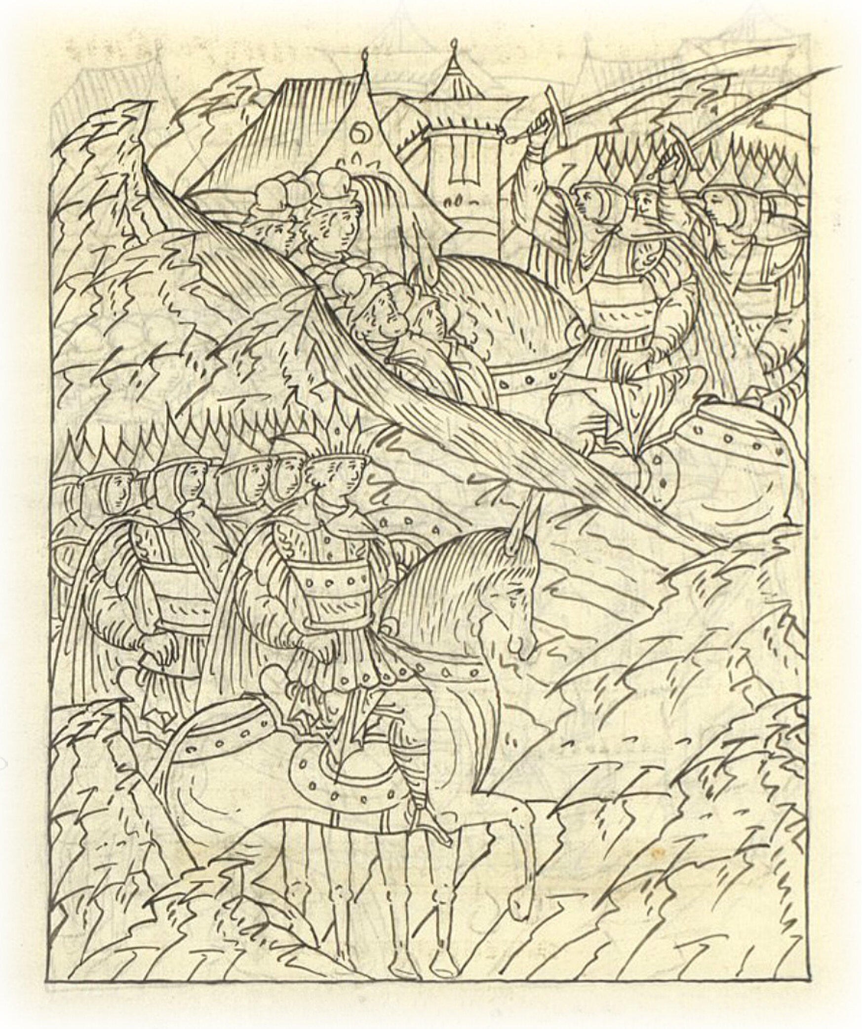 Языки говорят воеводам царя Ивана Васильевича, что магистр окопался большим рвом вокруг города Рындола, бьет из пушек и пищалей и приступает к Рындолу.