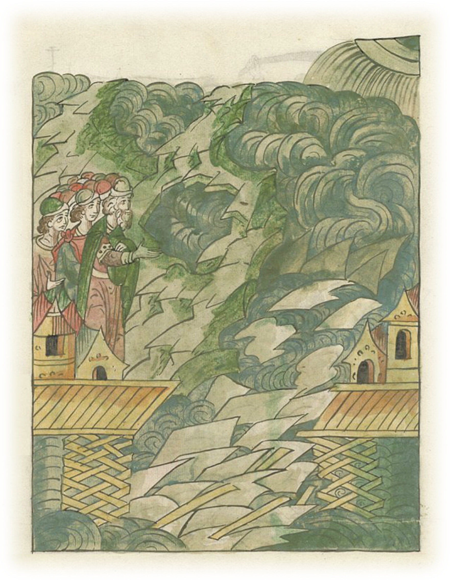 Той же осенью было половодье великое, сверх меры разлились озера и реки, и многие беды сотворили людям; и наступили морозы, и померзла большая вода в озере в Ильмени; и снова поднялись ветры сильные и великие, и изломали лед, и вспять погнали воду, и внесли в Волхов льда больше обычного; и выломало девять городень из великого моста.