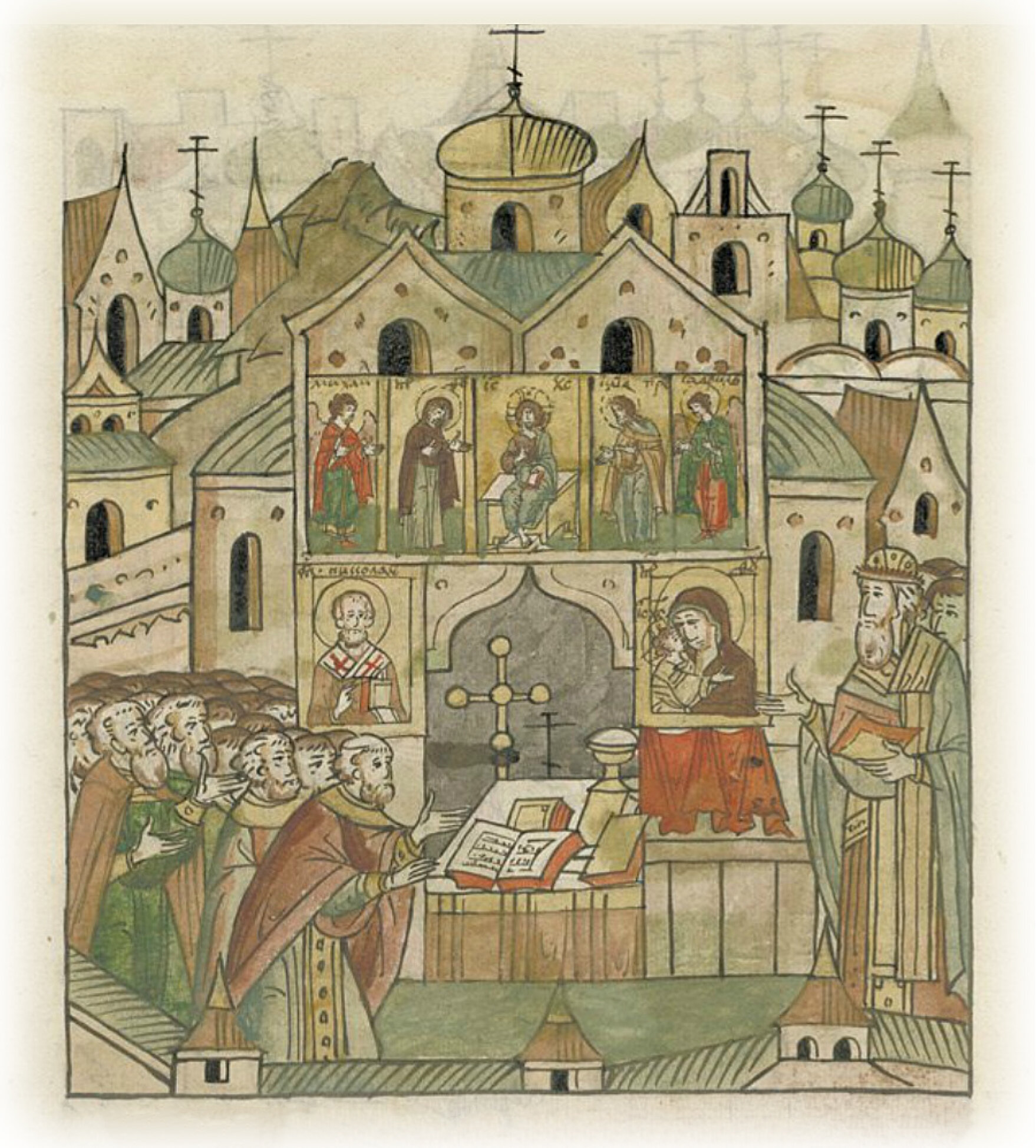 А священники всего города, шести соборов, по благословению архиепископа Макария положили Евангелие-тетр в святом алтаре на престоле и украсили его паволокою честною и серебром, как надлежит на престоле быть; а христоименитые люди украсили церковь Деисусом и святыми иконами, и честными крестами, и священными книгами. И было чудесно видеть это. А преосвященный архиепископ молебен совершал даже и до вечернего времени.