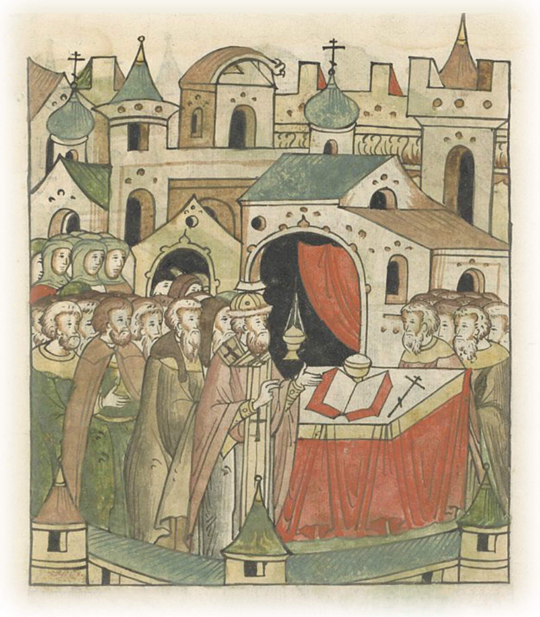 И, когда с Божьей помощью завершен был верх у церкви, тогда вошел сам архиепископ в церковь, и с ним собор святой Софии, и честные игумены, и всего города священники, и сам освятил ее во имя святого и славного апостола Марка, по жребию. Ибо прежде во всем городе не было храмов святых апостолов и евангелистов Матфея и Марка, и по жребию поставили церковь святого Марка, и святую литургию совершил во втором часу ночи.