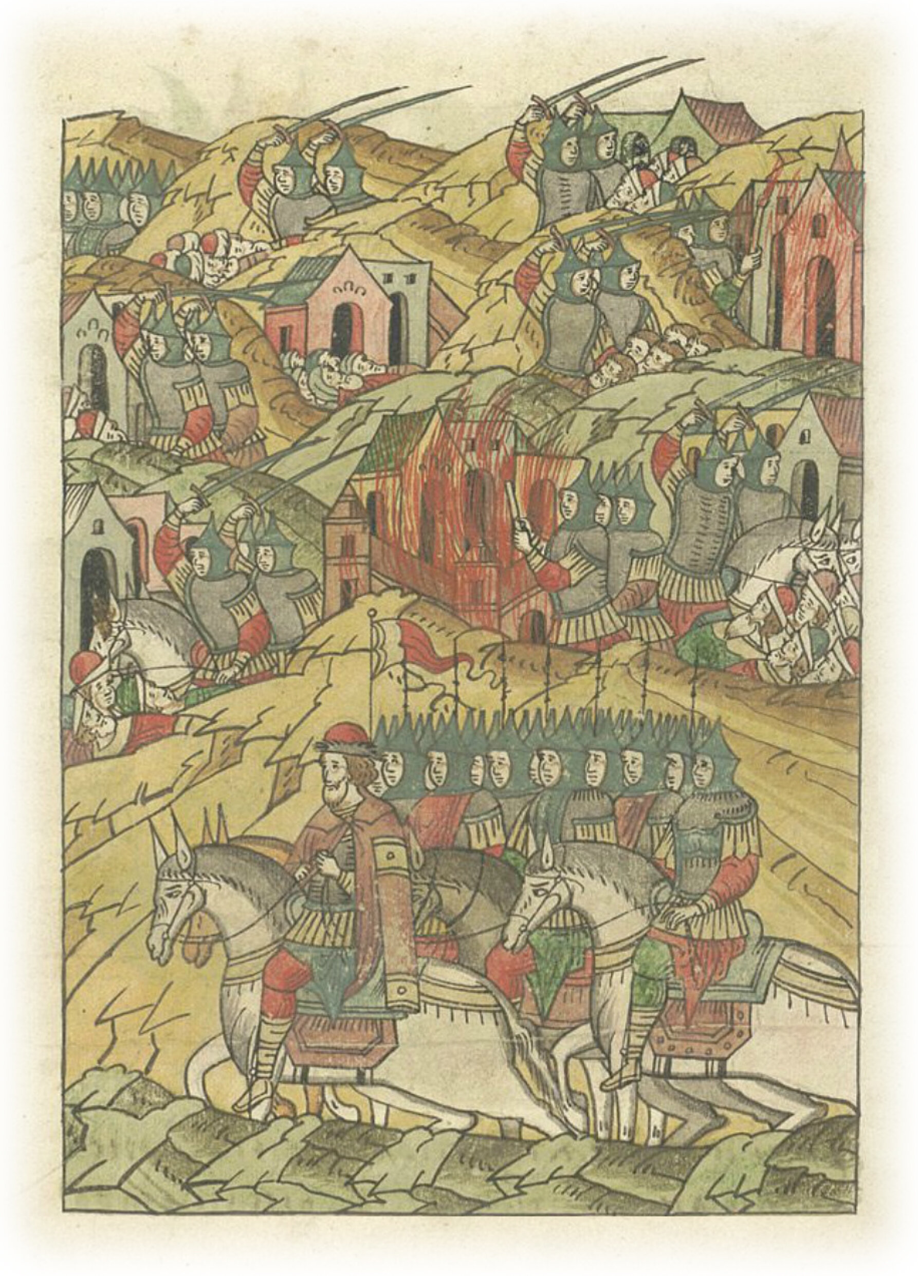 Став очень сильным, он отправился с войском на Александрию Египетскую, побил, пожег и пленил живших там сарацин, татар, аравитян, армян, турок, фрязов, дикатов, формасов, черкесов, барменов и жидов.