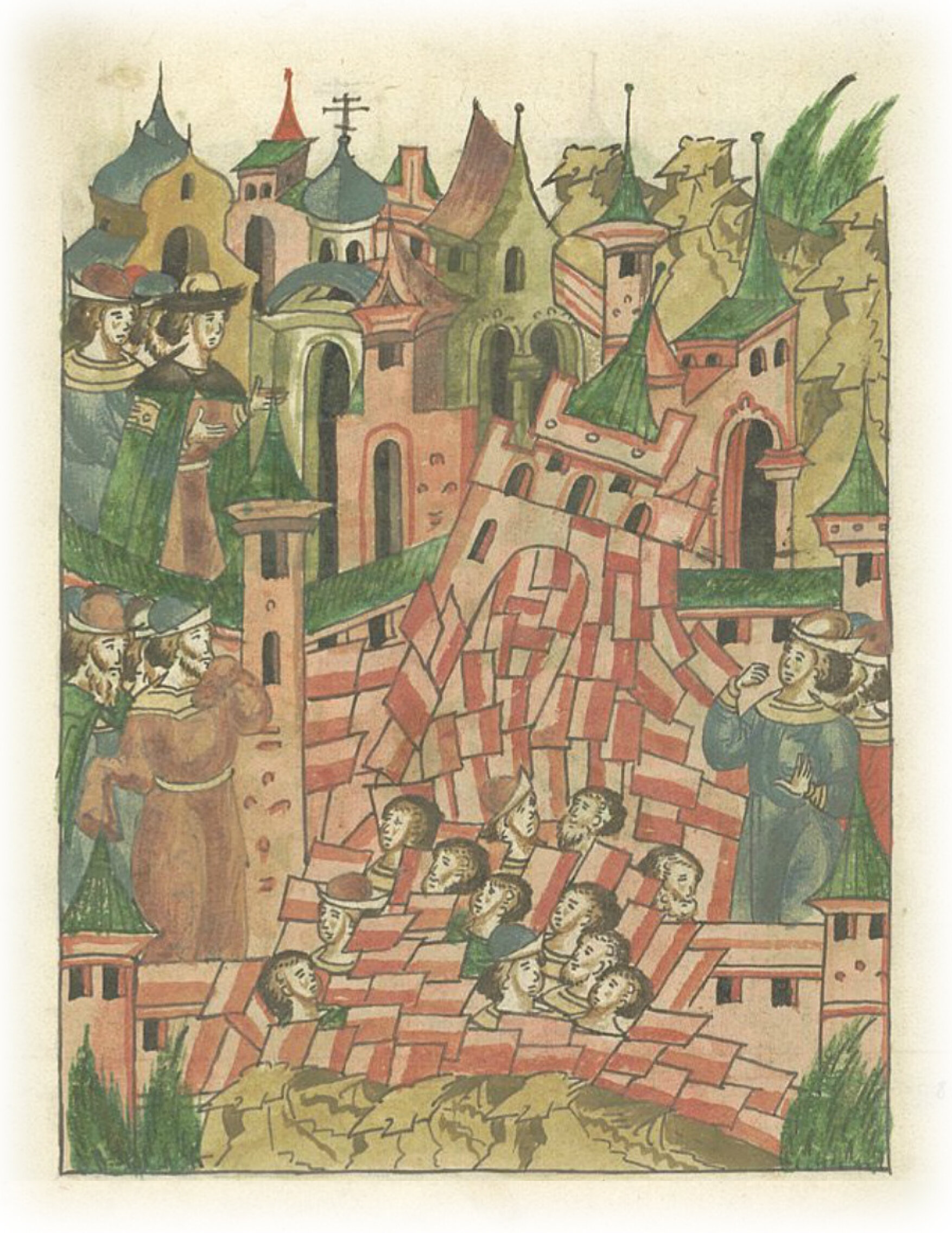 И еще не успела просохнуть известь, как сошлось множества народа, чтобы полюбоваться красотой их, как вдруг врата пали, и под ними засыпало камнями двенадцать человек.